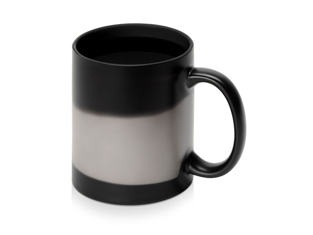 Кружка-хамелеон меняет свой облик, едва вы нальете в нее горячий напиток: черная поверхность постепенно изменяет свой цвет, становясь белой. Внутренняя часть кружки — яркая, цветная, что можно красиво обыграть, удачно сочетая ее с цветом вашего лого или гаммой изображения.