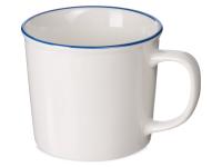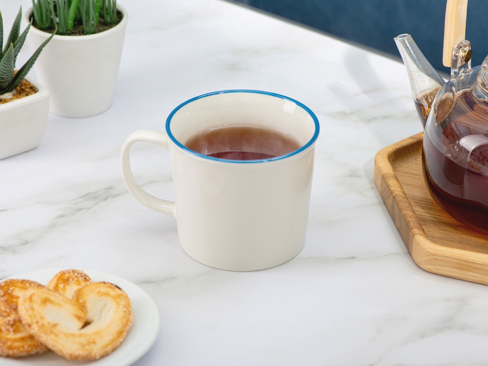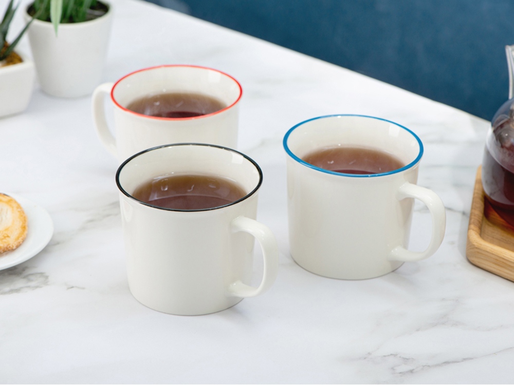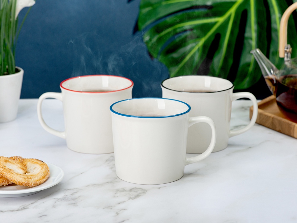 Кружка из костяного фарфора с выраженным рельефным ободком, окаймленным цветной контрастной полосой. Цвет полосы можно органично сочетать с цветом нанесенного логотипа, что придаст дизайну конечного продукта цельность облика.