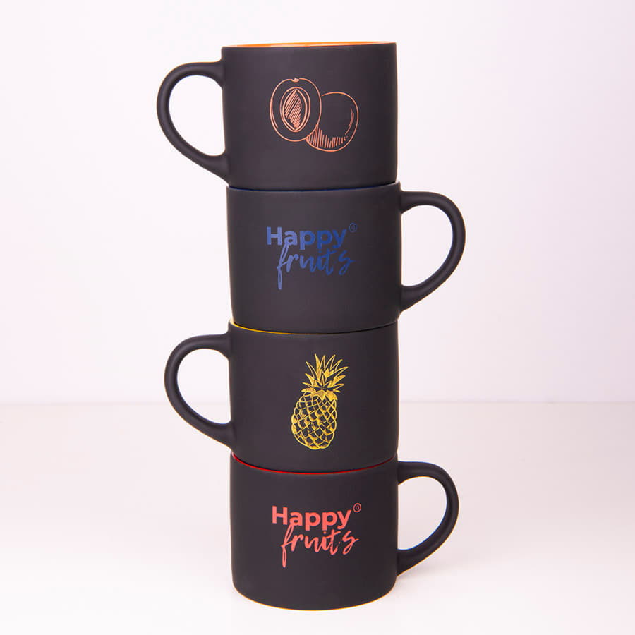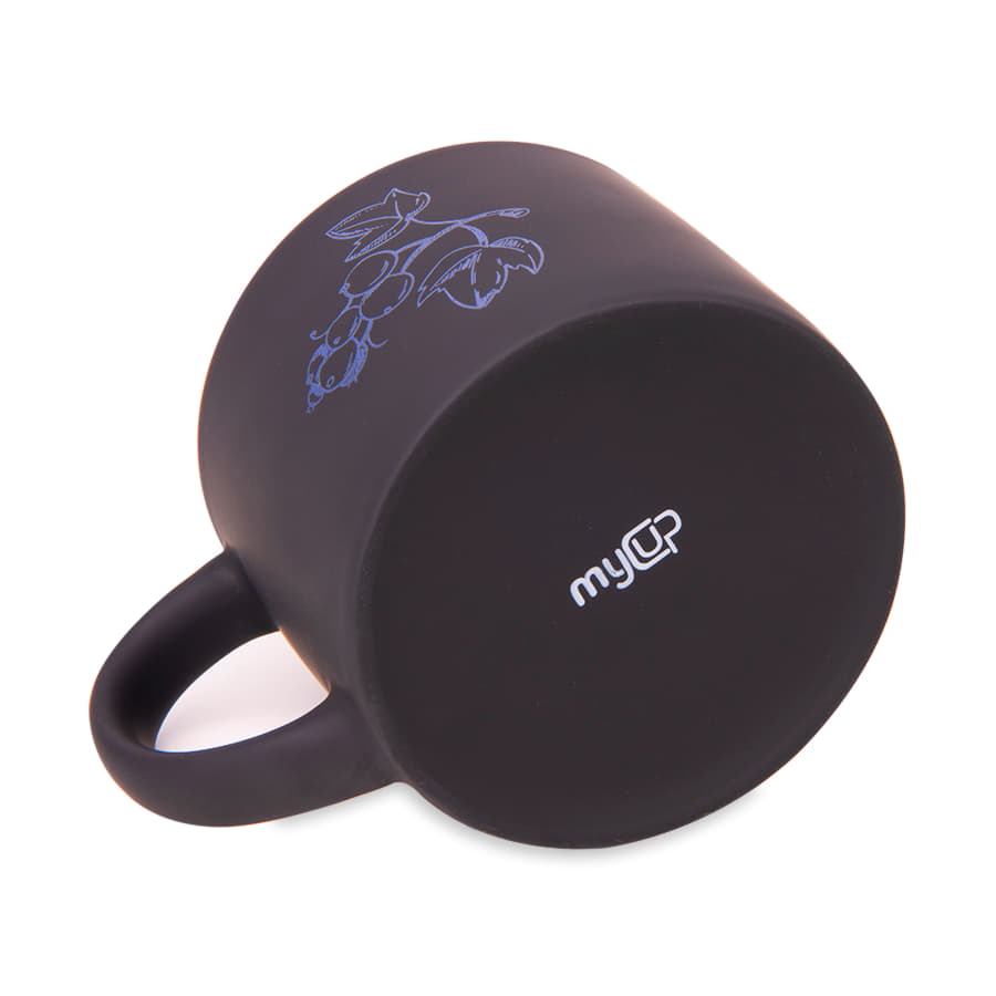 Кружка трендовой цилиндрической формы с черным прорезиненным покрытием.
