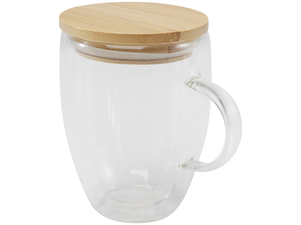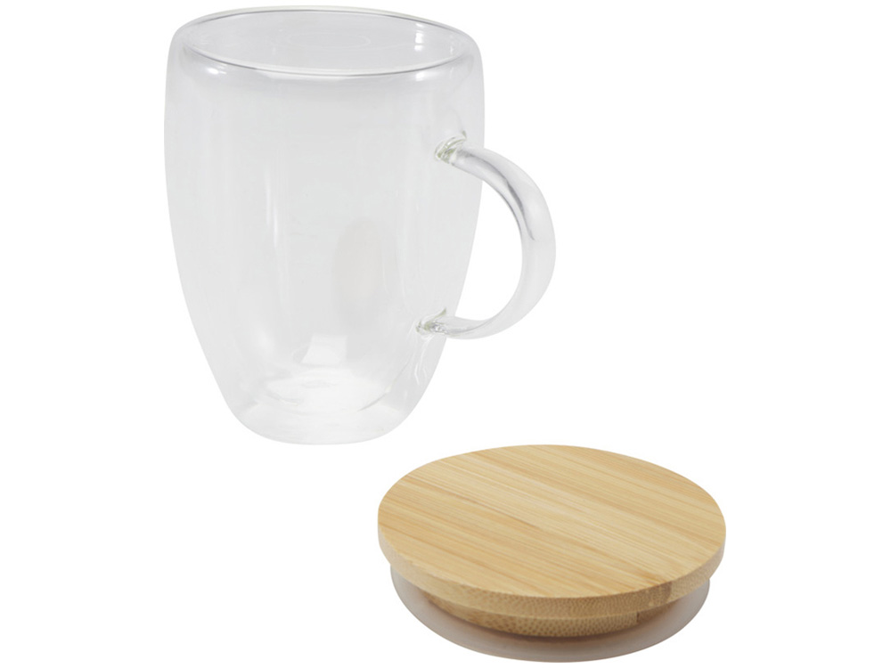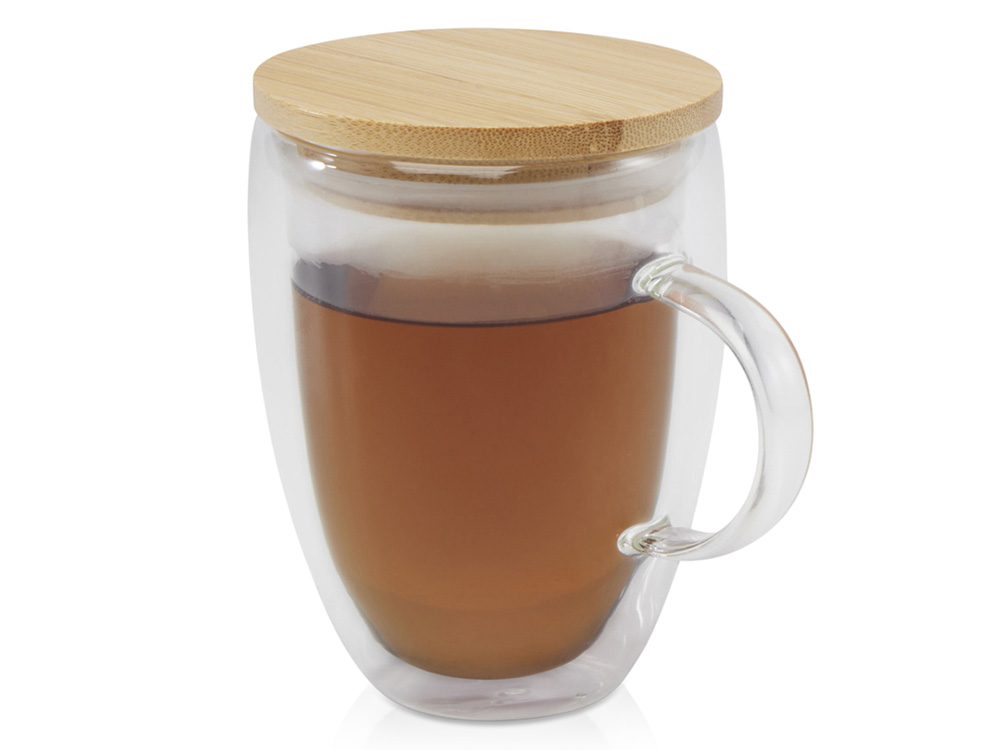 Стеклянная кружка Leona объёмом 350 мл с двойными стенками и стильной бамбуковой крышкой. Она дольше сохраняет температуру напитка, помогает избежать проливов и бережно удерживает его аромат. Идеальный выбор для уютного чаепития или кофе-паузы.