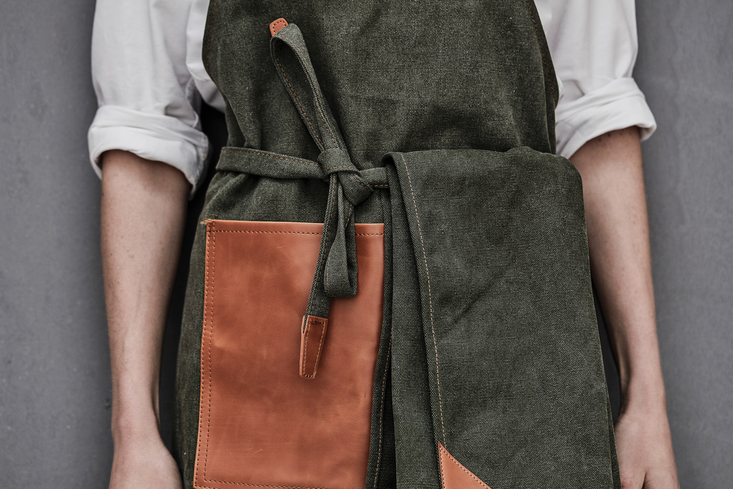 Прочный фартук из вареного канваса плотностью 500 г/м² декорирован деталями под натуральную кожу. Благодаря текстуре ткани со временем изделие становится только лучше.
