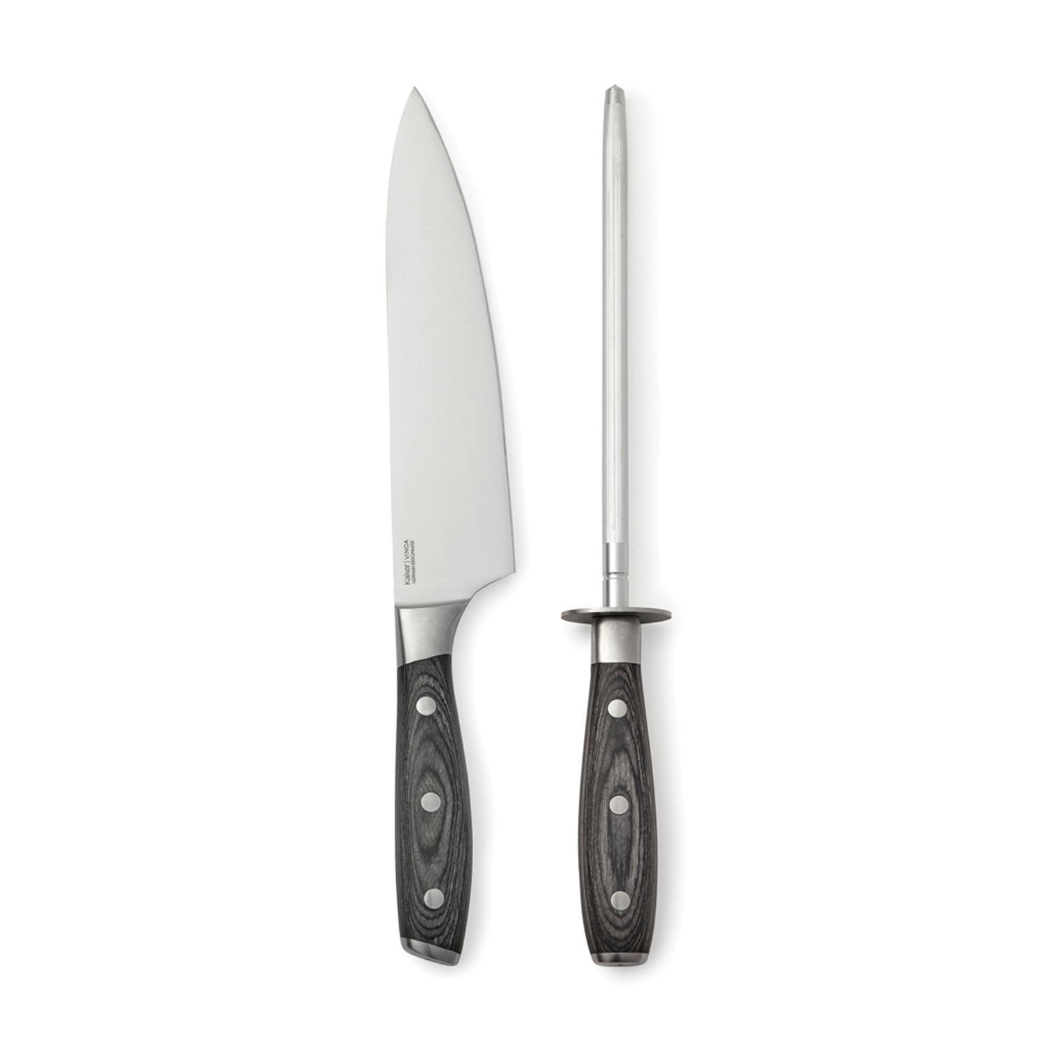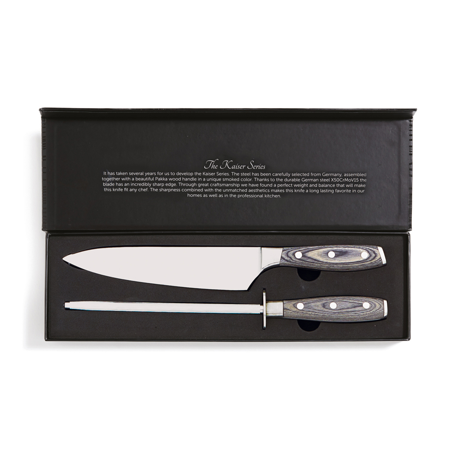 Почувствуйте себя настоящим шеф-поваром с набором из серии Kaiser! Он состоит из точилки и кухонного ножа, изготовленных из немецкой нержавеющей стали. Их ручки сделаны из паккавуда — это материал, состоящий из древесины ценных пород и смолы. Так называемая ламинированная древесина получается очень прочной и долговечной, не скользит в руке, не впитывает запахи и не поддается влаге. Сталь устойчива к повреждениям и неприхотлива в уходе: достаточно лишь периодически затачивать нож, и он прослужит вам долгие годы.