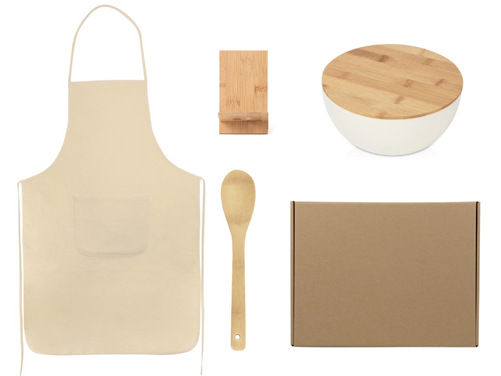 салатник - 50% бамбуковое волокно, 30% кукурузный крахмал, 20% полимеры; крышка - натуральный бамбук, ложка, подставка - бамбук, фартук - хлопок, коробка - картон