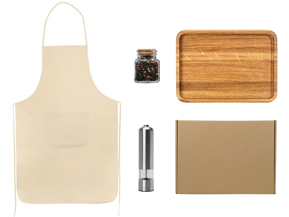 флеш-карта - пластик,металл, мельнца - нежавеющая сталь, оргстекло, ПП пластик, керамические жернова, поднос - дуб, фартук - хлопок, коробка - картон