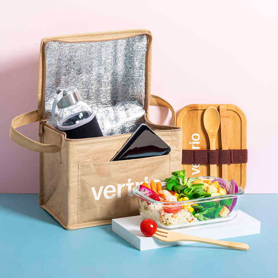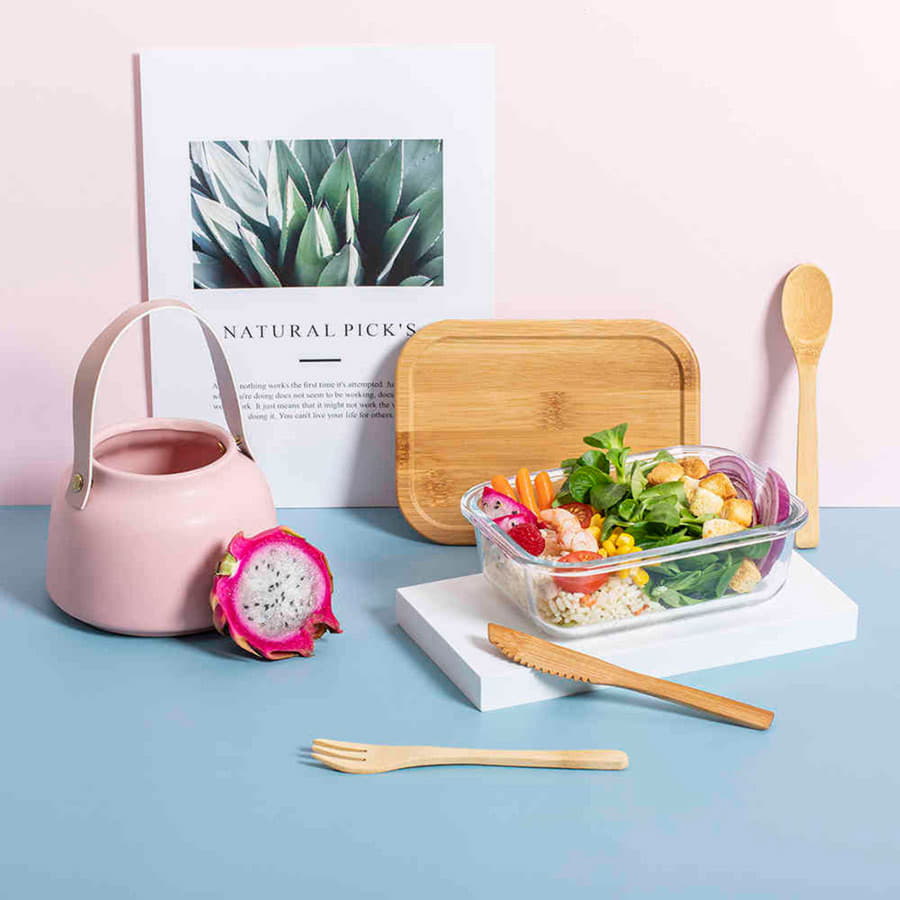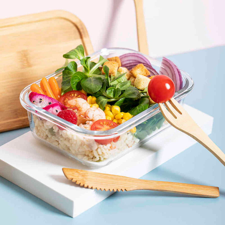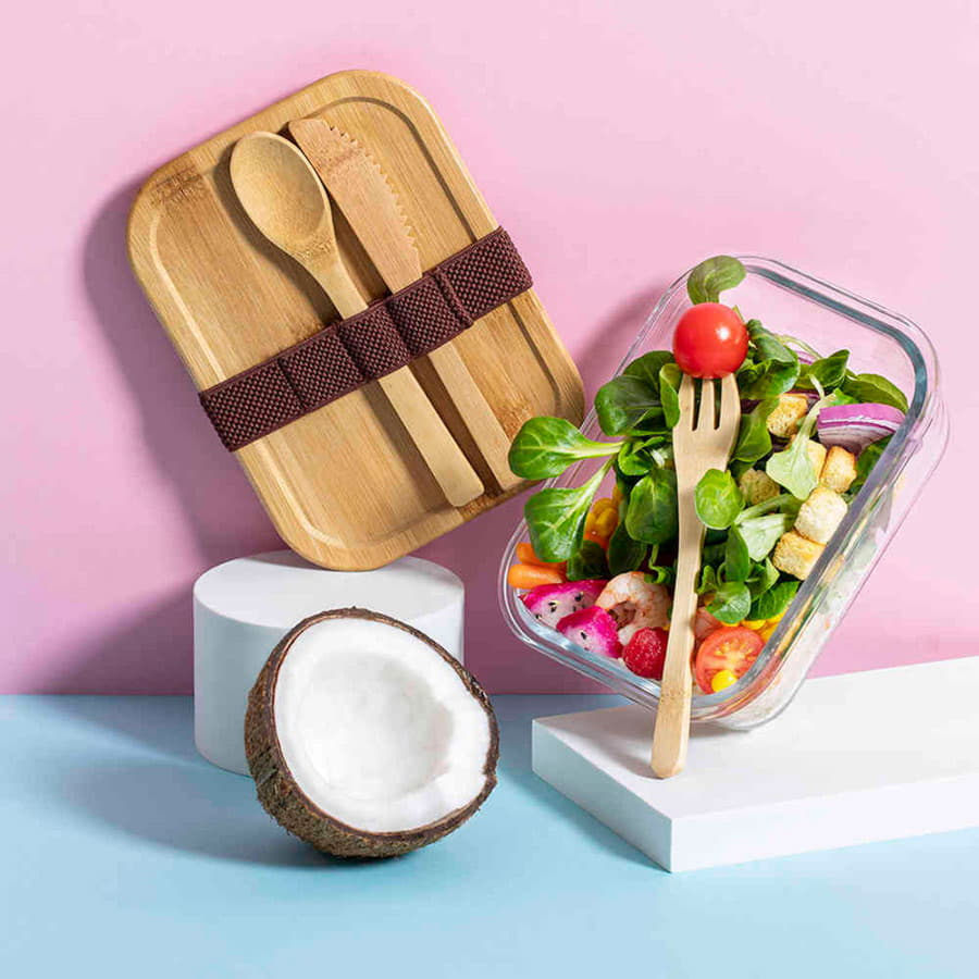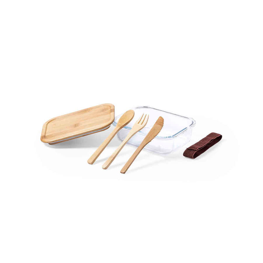Ланч-бокс с крышкой и столовыми приборами: ложка, вилка, нож.
