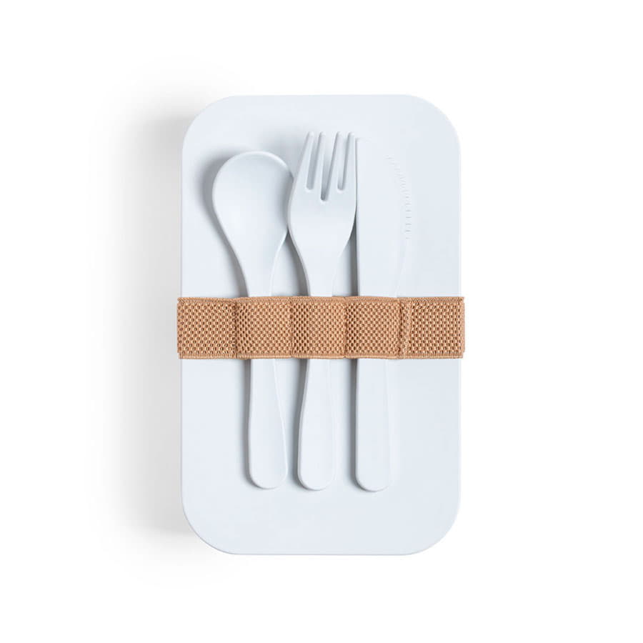 Ланч-бокс с крышкой и столовыми приборами: ложка, вилка, нож. Они крепятся на специальной резинке на корпусе изделия.