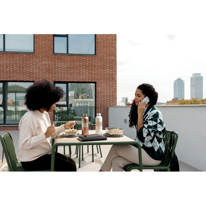 Ланчбокс из переработанной нержавеющей стали с крышкой из переработанного полипропилена и 4-сторонней застежкой. Вместимость: 850 мл.