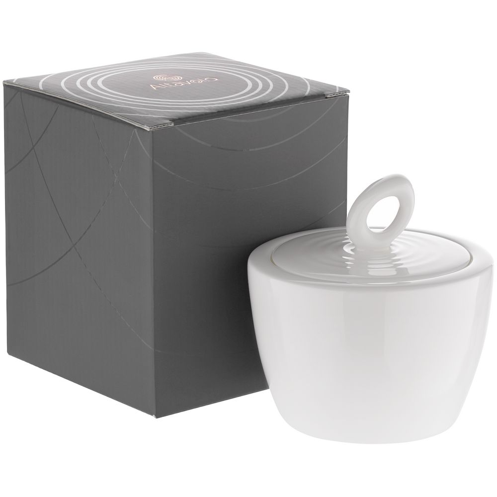 Крышка сахарницы создана в скульптурной технике: фарфор словно запечатлел сам момент движения. Необычная ручка предметов символизирует камень, от которого появляются завораживающие круги на воде.