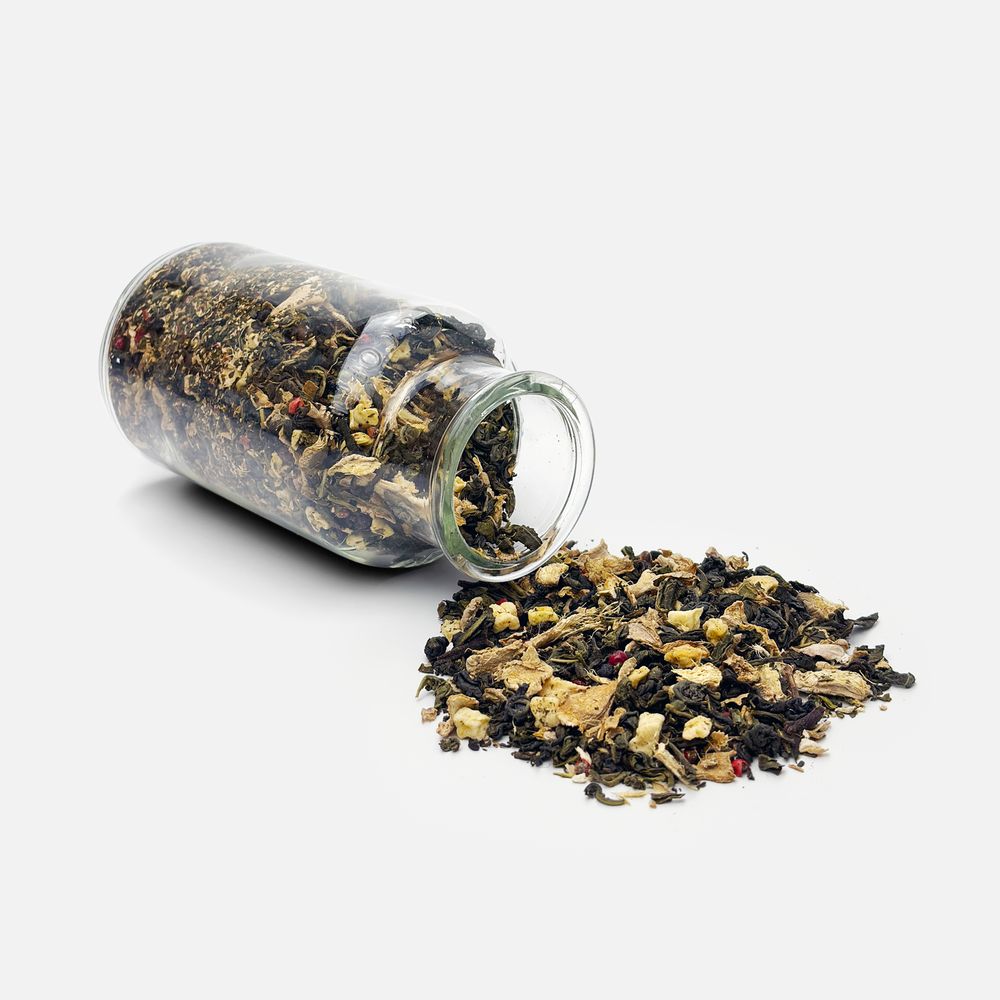 Состав: чай зеленый с имбирем и соком имбиря (чай зеленый байховый крупнолистовой, кусочки имбиря, сок имбиря), яблоко сублимированное, розовый перец, гвоздика, ароматизатор Персик, ароматизатор Яблоко.
