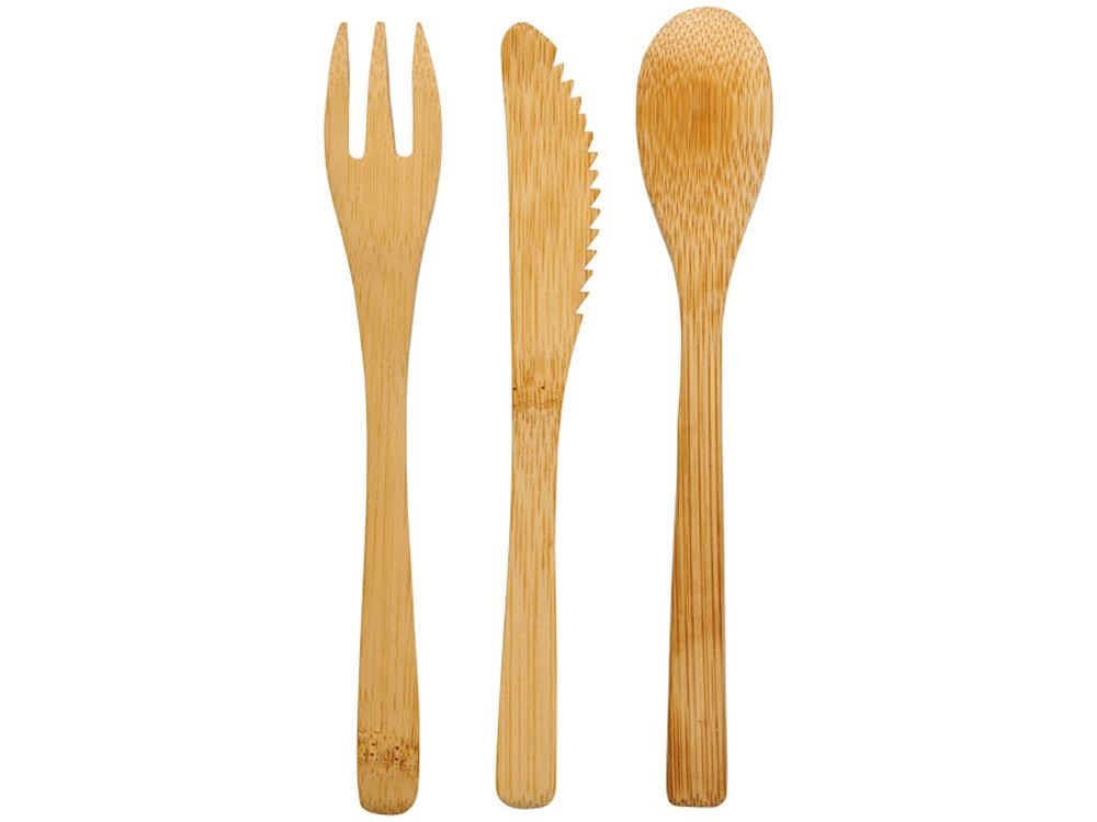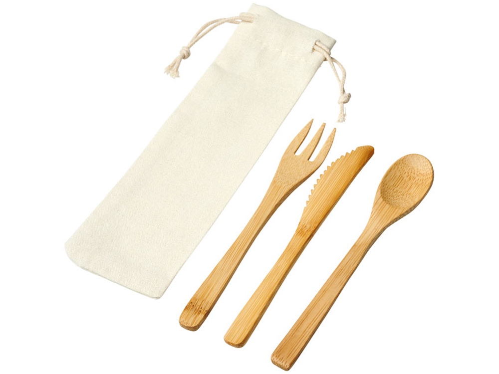 Набор столовых приборов Celuk из бамбука. Набор столовых приборов из бамбука состоит из вилки, ножа и ложки. Поставляется в нетканом мешочке. Бамбук.