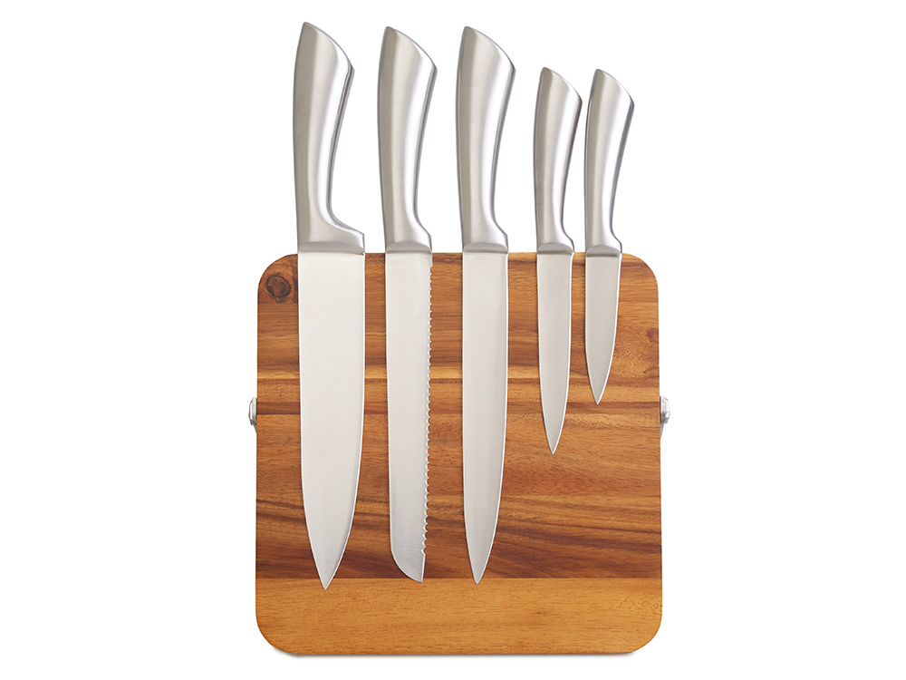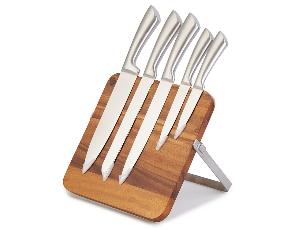 Набор ножей Терон на магнитной подставке из акации — это отличное решение для организации рабочего пространства на кухне. В комплекте пять ножей из нержавеющей стали и подставка, которая объединяет функциональность и природный стиль.