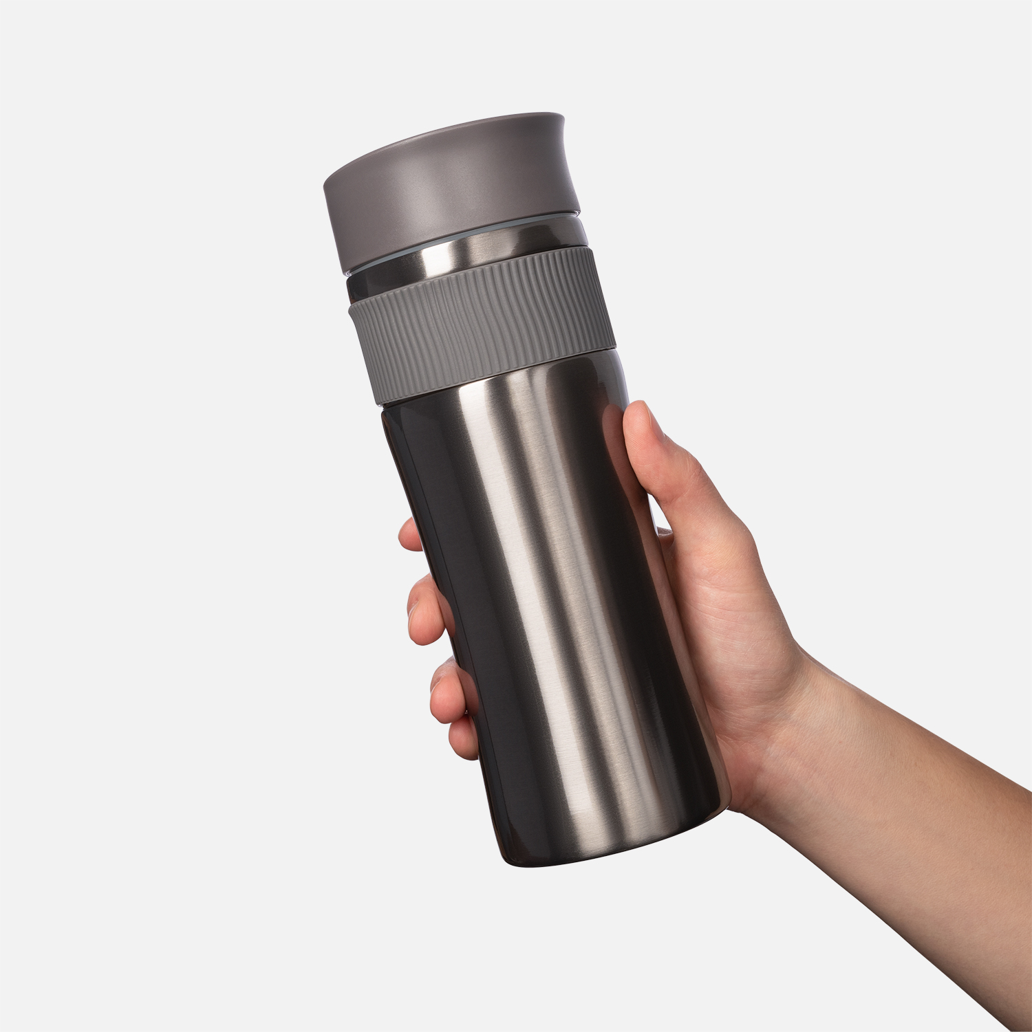 Термокружка с системой OneHand Open позволяет пользоваться кружкой одной рукой. Силиконовый манжет на корпусе не позволит кружке выскочить из руки в самый не подходящий момент.