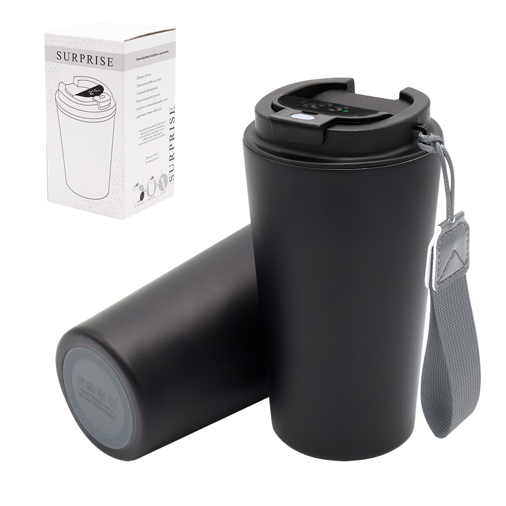 Термокружка Surprise To Go с дисплеем выполнена из пищевой нержавеющей стали. Имеет двойные стенки с вакуумной изоляцией, а крышка изготовлена из пищевого безопасного для человека пластика. Термокружка Surprise To Go не только сохраняет ваши напитки горячими, но и показывает температуру напитка! Уникальная особенность данной термокружки – наличие сенсорного индикатора температуры, расположенного в крышке. Чтобы узнать температуру напитка внутри кружки, достаточно прикоснуться к поверхности крышки. Работает от 1 батарейки типа CR2032 (в комплекте), которую в последующем можно самостоятельно заменить.