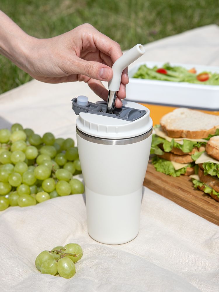- 2 крышки в комплекте: одна на 100% герметичная с механизмом блокировки отверстия для питья, вторая — с отверстием для трубочки
