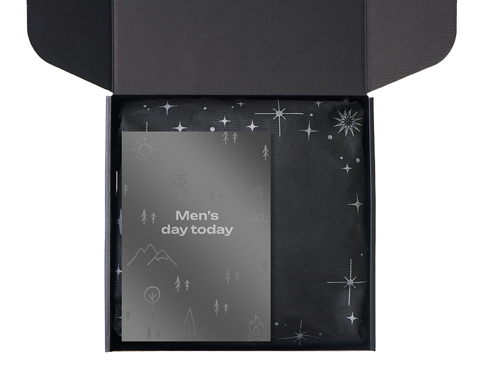 нетканый материал, термокружка - нержавеющая сталь, пластик, кофе в дрип пакете - пластик, обложка для паспорта - полиуретан, косметичка - переработанный оксфорд, мешок - нетканый материал (спанбонд)