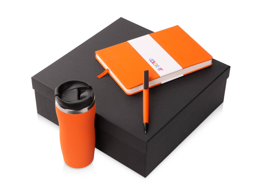 блокнот - искусственная кожа с покрытием soft-touch, ручка - пластик с покрытием soft-touch, бутылка - нержавеющая cталь с покрытием soft-touch.