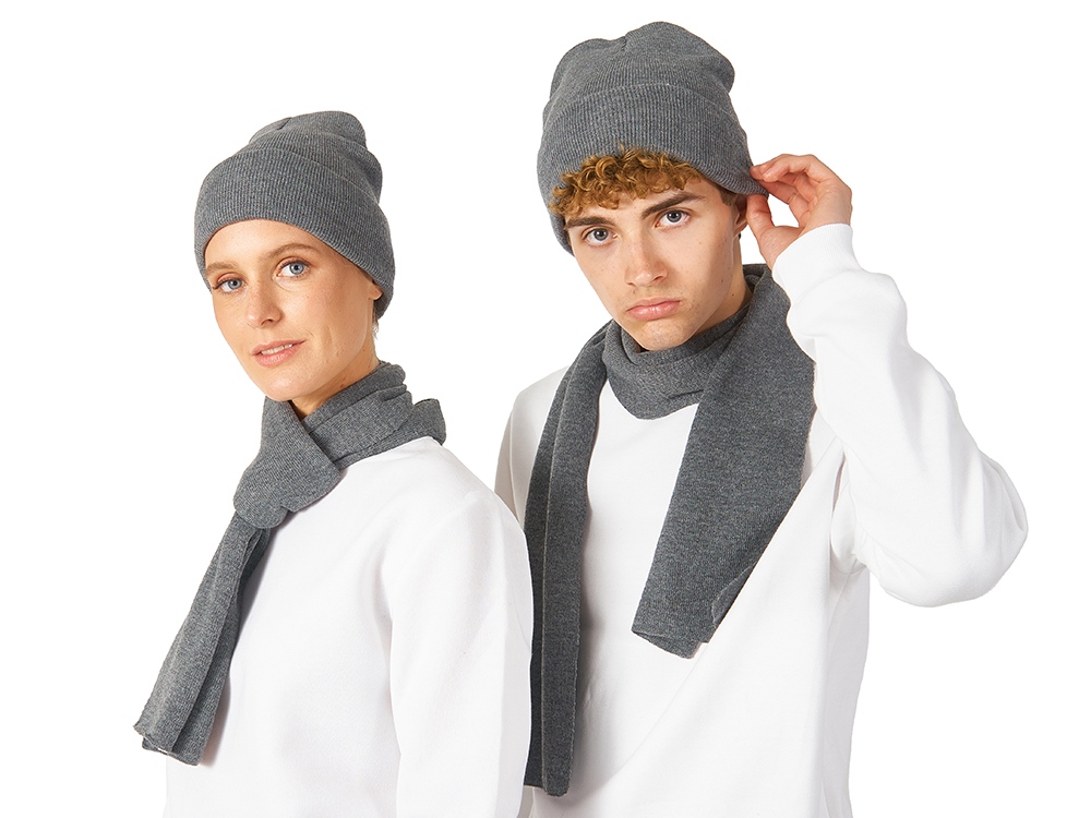 нетканый материал, варежки - 100% акрил, шарф - 100% акрил, термос - нержавеющая сталь, открытка - бумага, мешок - нетканый материал