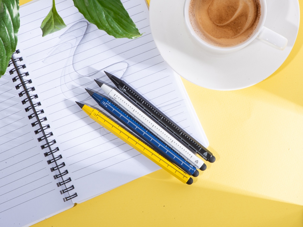 Карандаш изготовлен из переработанного алюминия. В отличие от обычных карандашей его не нужно точить, и он не пачкает руки.