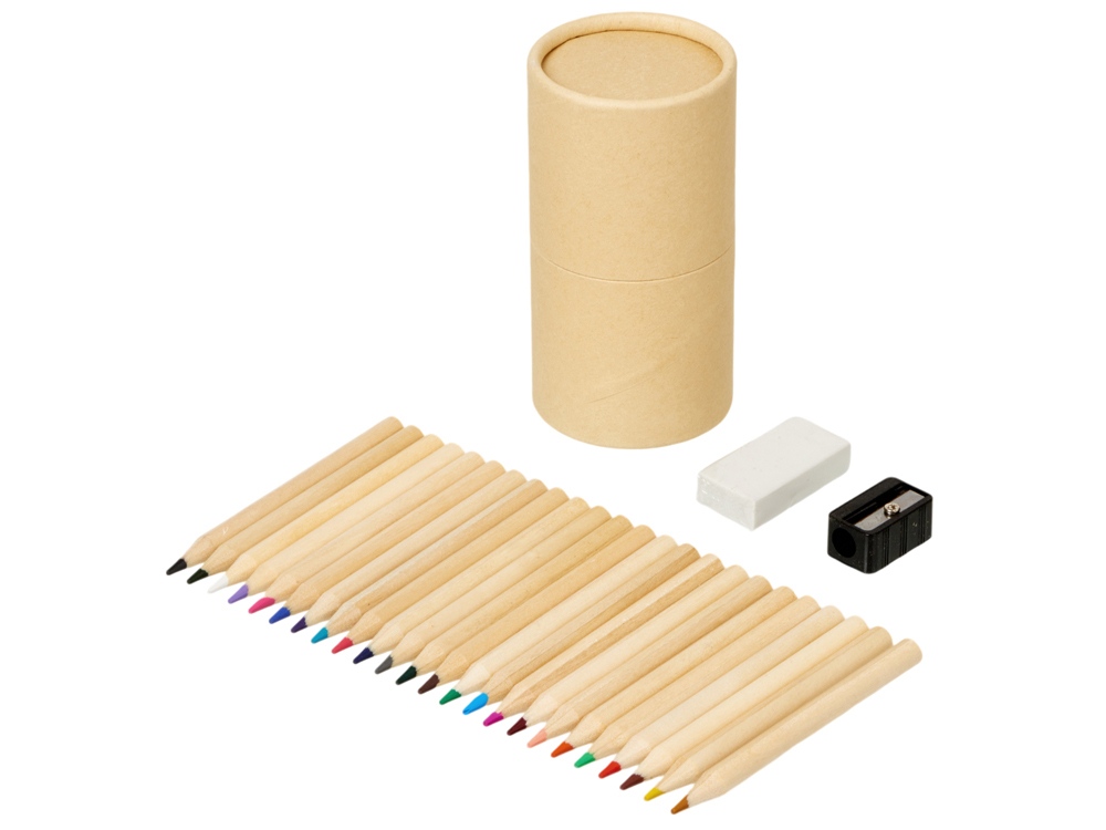 Набор из 24 цветных карандашей, ластика и точилки в круглом картонном футляре, который удобно использовать как карандашницу.