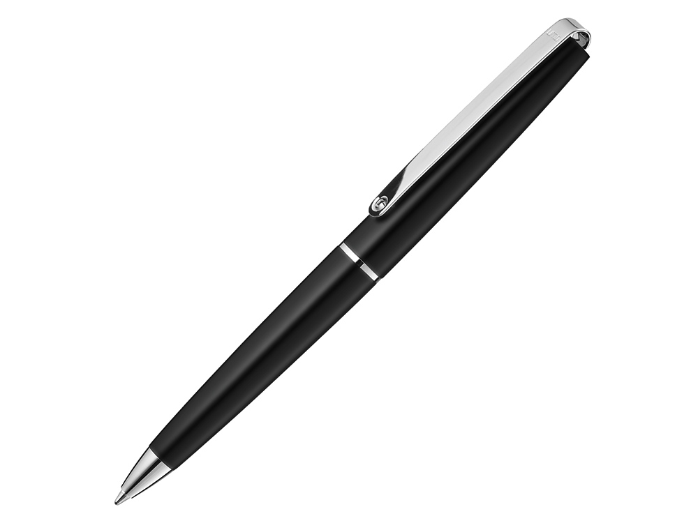 Металлическая шариковая ручка с мягким поворотным механизмом, глянцевым корпусом, длинным гибким металлическим клипом, декоративное кольцо и наконечник с глянцевой хромированной отделкой.