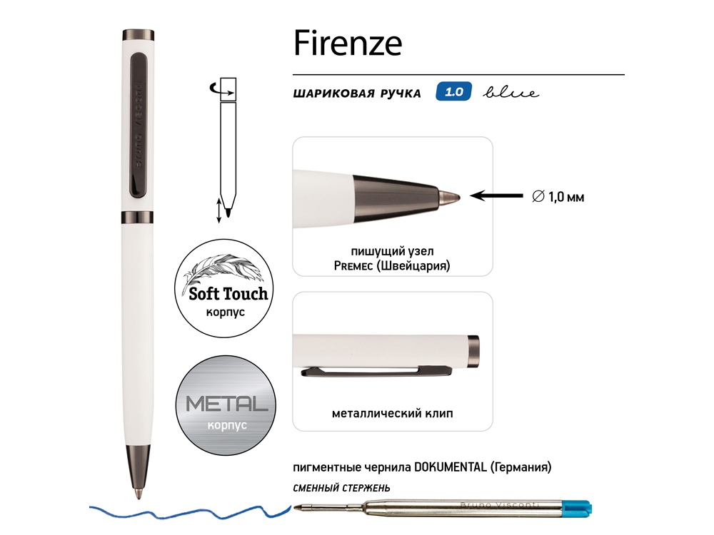 Ручка автоматическая, с легким поворотным механизмом подачи стержня. Надежный пишущий узел d 1,0 мм (от швейцарского производителя Premec) гарантирует высокое качество также, как и пигментные чернила Dokumental (Германия). Благодаря им писать ручкой Firenze одно удовольствие – она мягко скользит по поверхности бумаги, оставляя ровную, четкую линию.