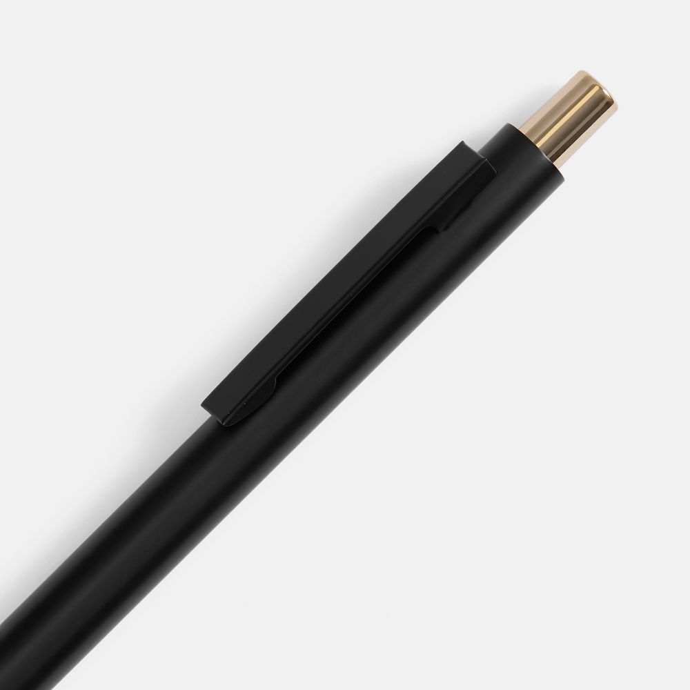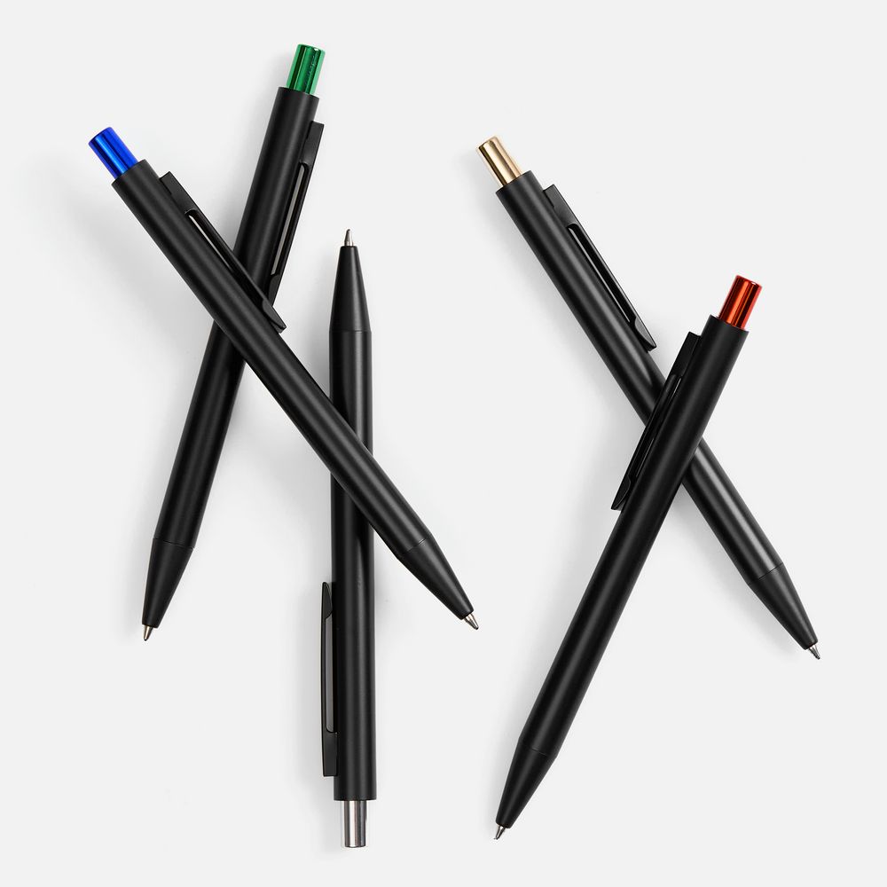 Ручка строгих форм в черном матовом корпусе с цветными деталями, которая точно может удивить, — гравировка на ней вскрывается цветом в тон кнопке.