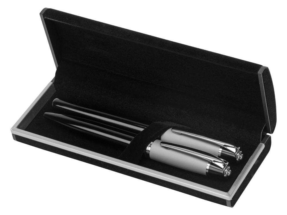 Стильный деловой набор в лаконичном черном футляре – идеальный по своей практичности сувенир. В набор входит шариковая ручка с поворотным механизмом и ручка-роллер с колпачком.