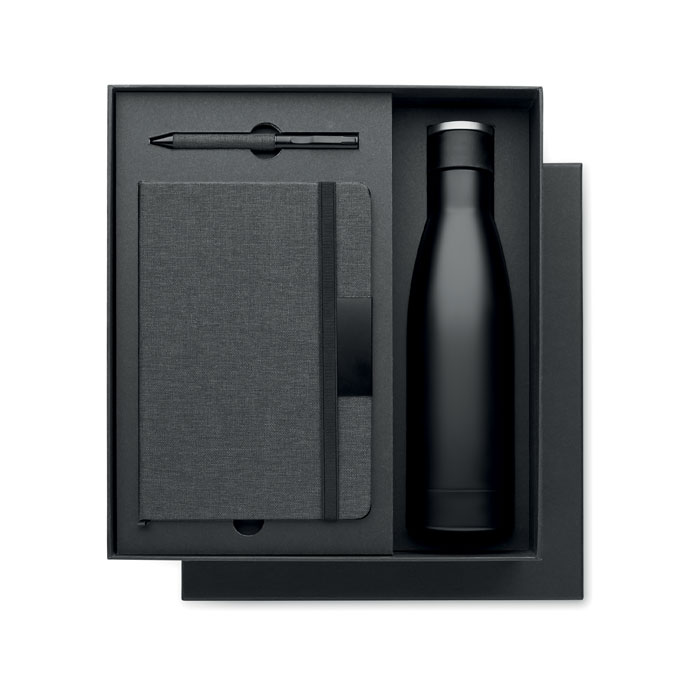 Роскошный подарочный набор из трех предметов: блокнот формата А5 в твердой обложке из RPET. В переплете. 160 линованных страниц из переработанной бумаги (80 листов). Шариковая ручка. Бутылка с двойными стенками из нержавеющей стали с вакуумной изоляцией. Объем: 500 мл. Поставляется в подарочной коробке. FSC®-certified | FSC MIX CREDIT, P7.1, FSC-C213206