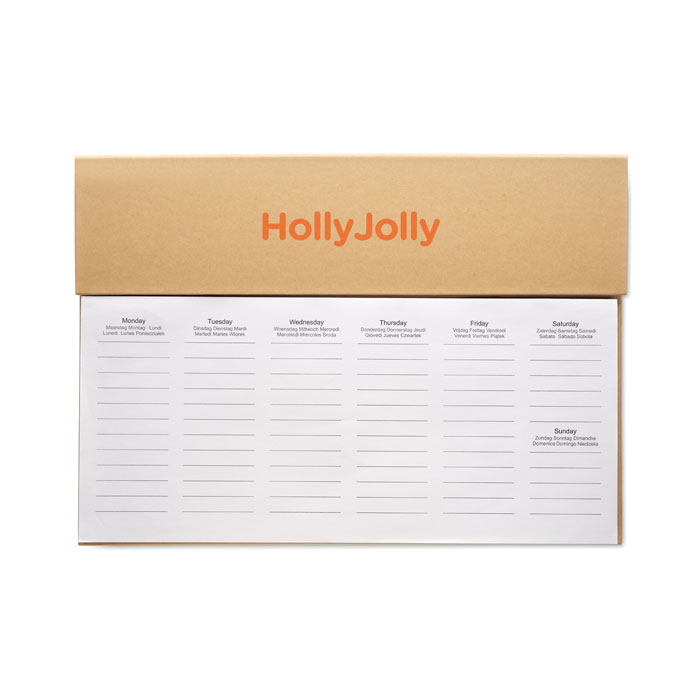 Настольный еженедельник-планер на 125 страниц на 6 языках (EN/DE/FR/ES/IT/NL/PL) с обложкой из крафт-бумаги, картонной ручкой с синими чернилами, деревянной линейкой и блокнотом со стикерами.