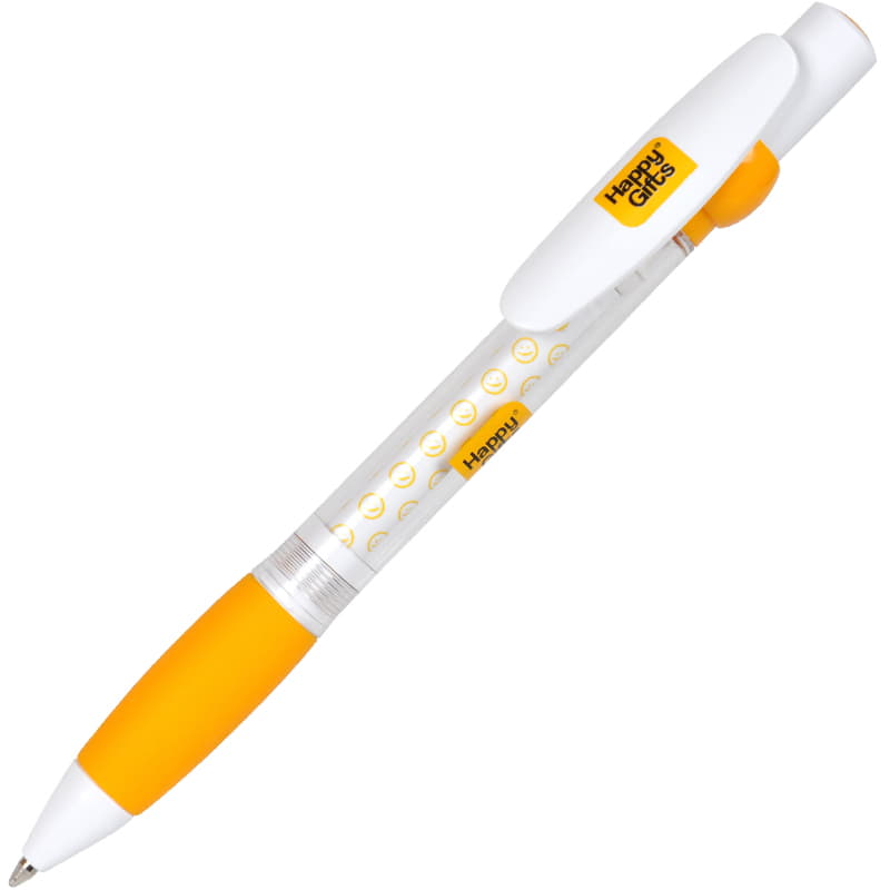 Ручка с прозрачным корпусом и белым барабанчиком вокруг стержня.