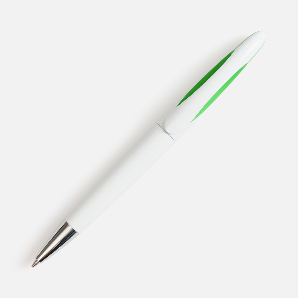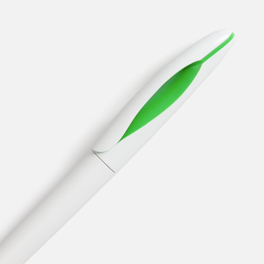Шариковая ручка приятных округлых форм с белым глянцевым корпусом и цветовым акцентом.