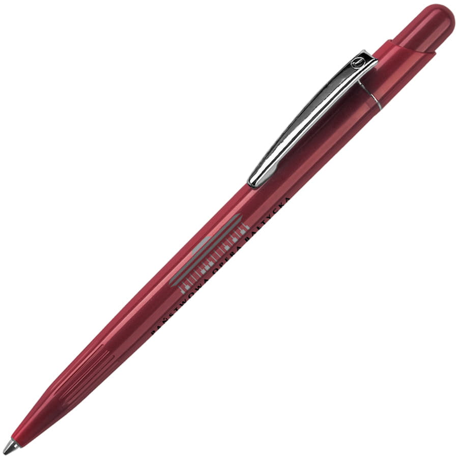 Элегантная ручка с серебристым клипом. Нажимной механизм подачи стержня. Цвет чернил синий.