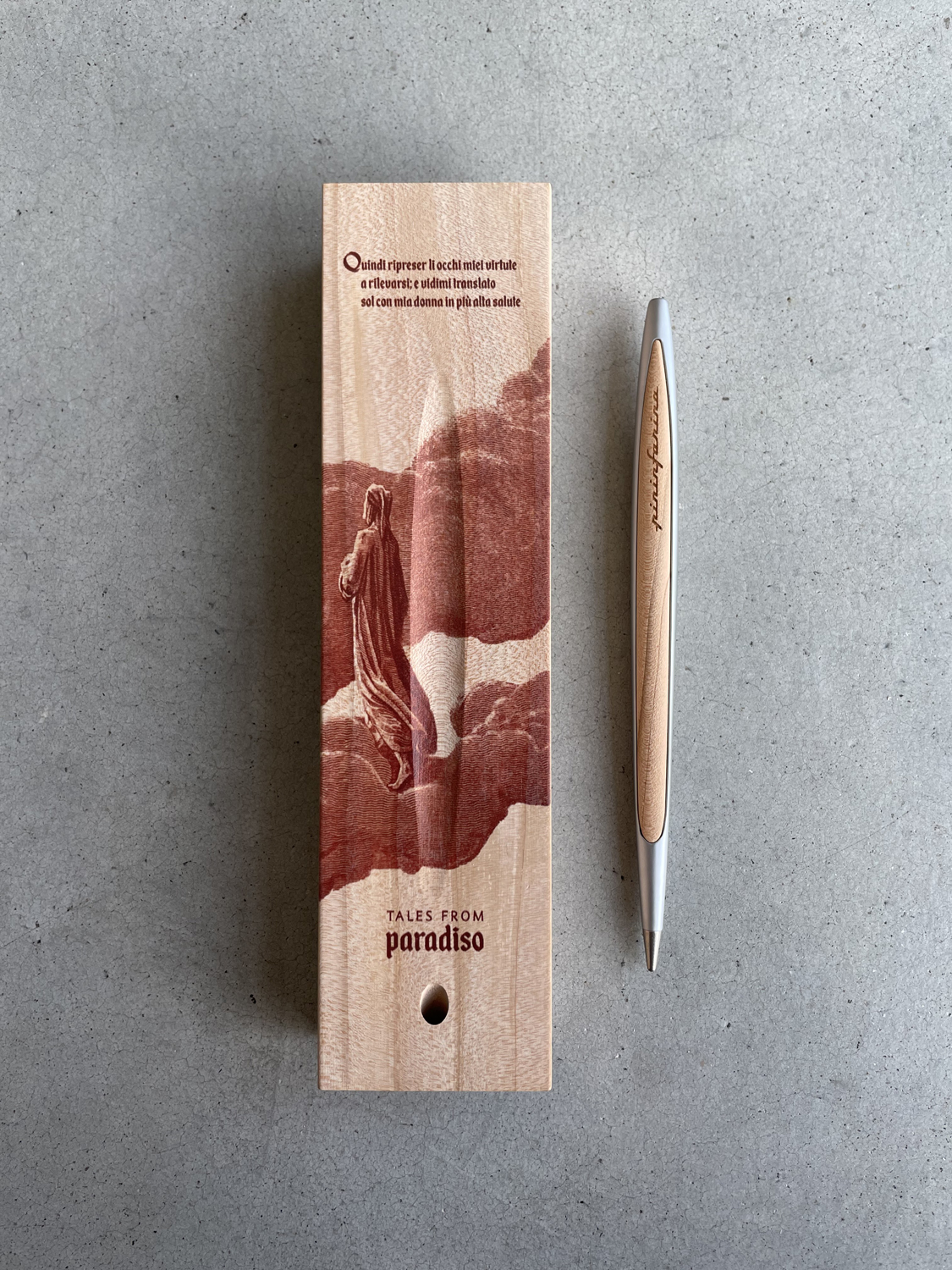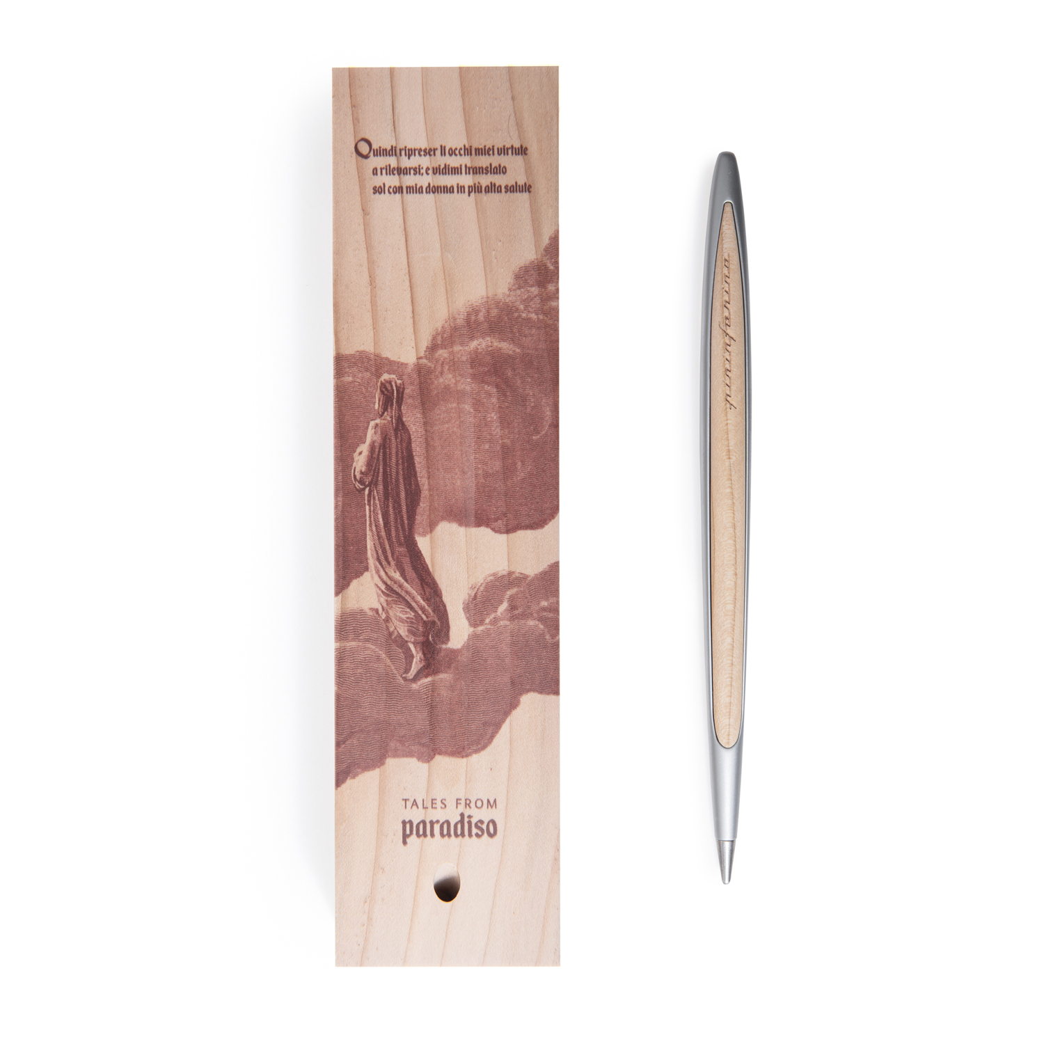 Лимитированная коллекция бренда Pininfarina в память о Данте Алигьере, приуроченная к 700-летию его смерти, с изображениями TALES FROM PARADISO - третьей части Рай знаменитой Божественной Комедии. Коробка из массива кедра, которая является одновременно настольной подставкой для вечной ручки Cambiano, с иллюстрацией Гюстава Доре, изображающей Рай в виде божественного леса, в котором дует легкий ветерок, создаваемый вращением небесных сфер. Вечная ручка имеет необычный пишущий узел в виде наконечника Ethergraf, который изготовлен из сплава металлов по запатентованной технологии. Он не содержит свинец и алюминий, производится вручную итальянскими мастерами и практически не расходуется за десятилетия использования. При соприкосновении с поверхностью бумаги, происходит химическая реакция и наконечник оставляет серебристый след, который напоминает цвет графитового карандаша, но обладает большей стойкостью. Идеально пишет на каменной бумаге. Корпус ручки выполнен из алюминия с вставками из кедрового дерева. Вес ручки 39 гр, длина 16 см.