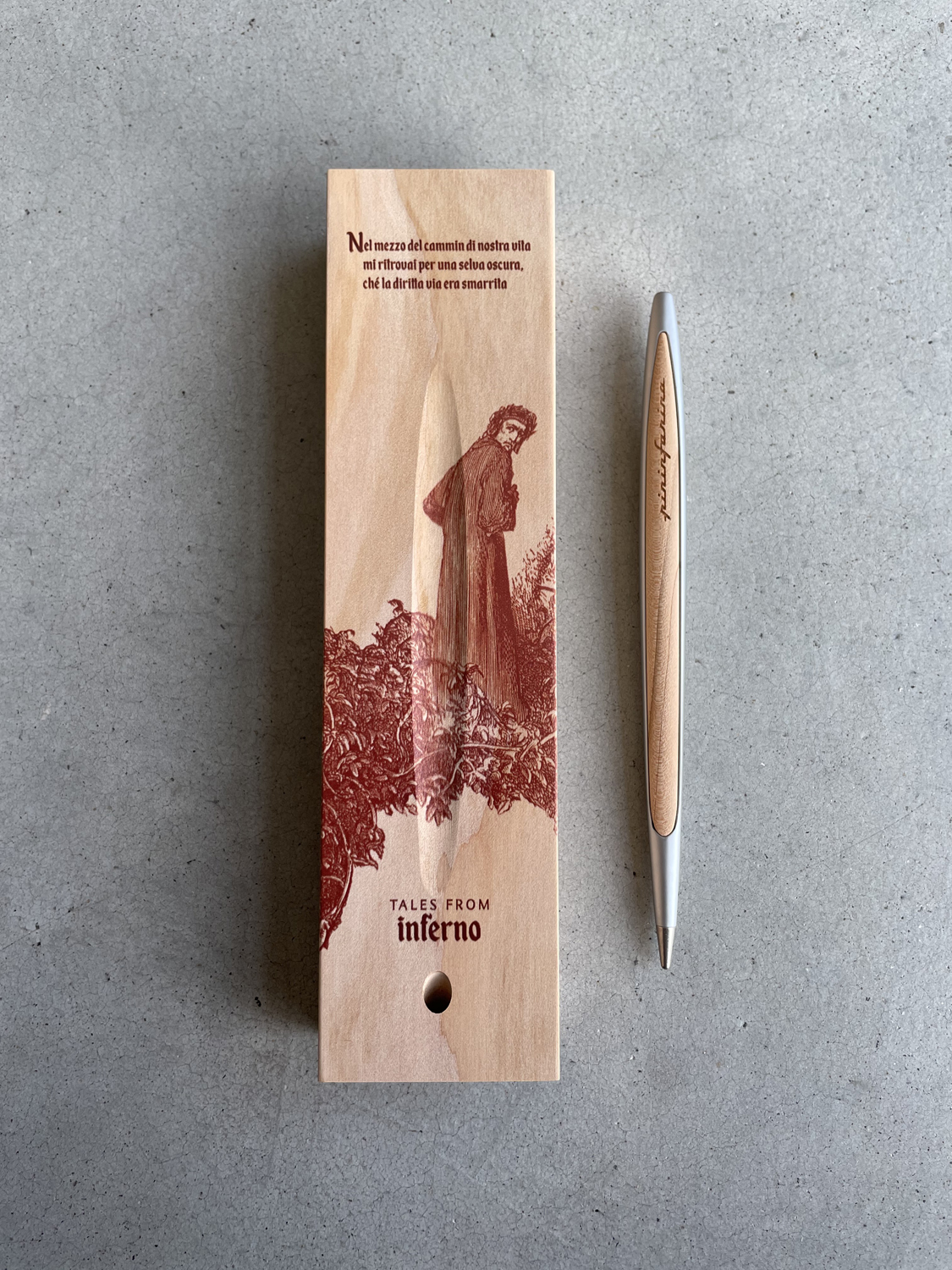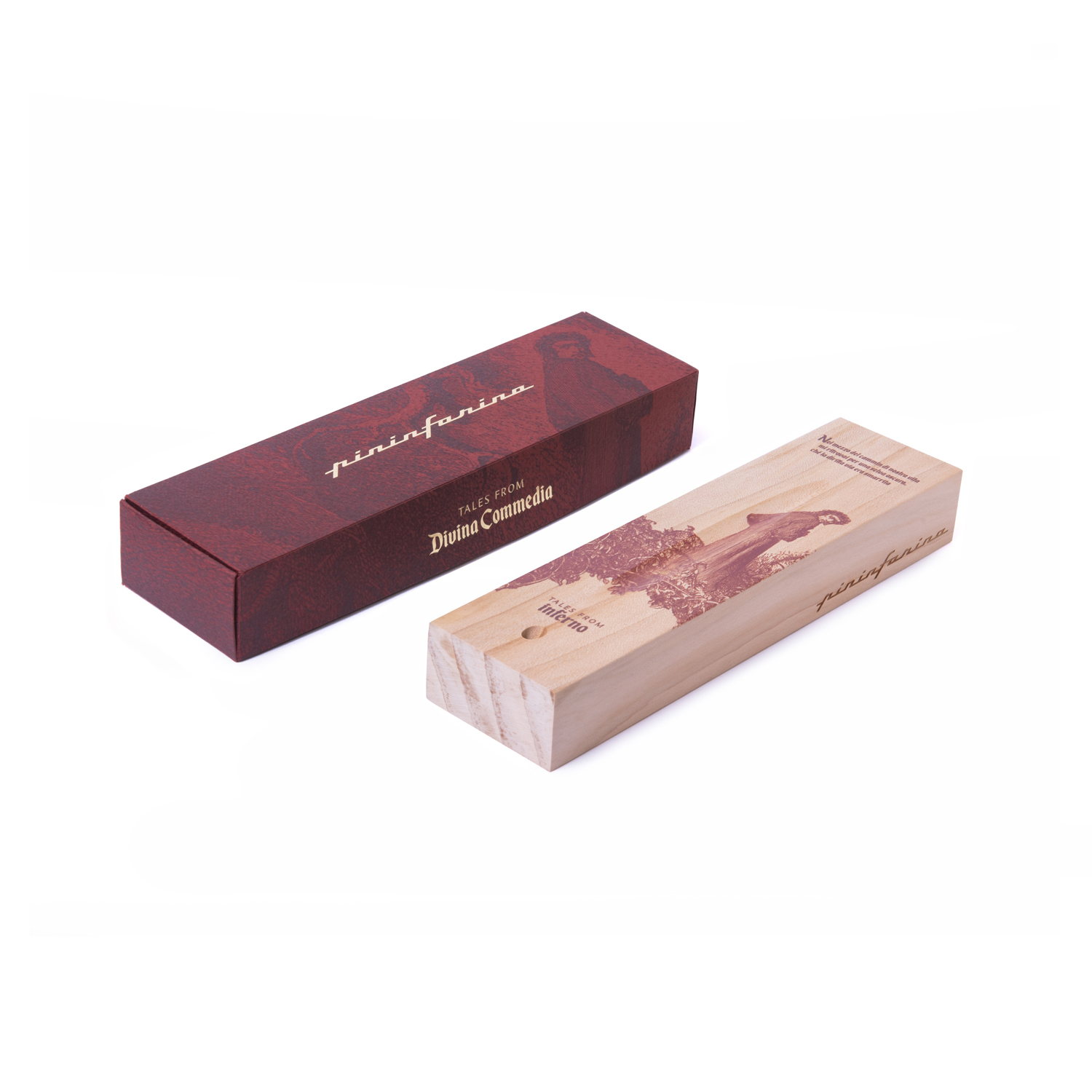 Лимитированная коллекция бренда Pininfarina в память о Данте Алигьере, приуроченная к 700-летию его смерти, с изображениями TALES FROM PARADISO - третьей части Рай знаменитой Божественной Комедии. Коробка из массива кедра, которая является одновременно настольной подставкой для вечной ручки Cambiano, с иллюстрацией Гюстава Доре, изображающей Рай в виде божественного леса, в котором дует легкий ветерок, создаваемый вращением небесных сфер. Вечная ручка имеет необычный пишущий узел в виде наконечника Ethergraf, который изготовлен из сплава металлов по запатентованной технологии. Он не содержит свинец и алюминий, производится вручную итальянскими мастерами и практически не расходуется за десятилетия использования. При соприкосновении с поверхностью бумаги, происходит химическая реакция и наконечник оставляет серебристый след, который напоминает цвет графитового карандаша, но обладает большей стойкостью. Идеально пишет на каменной бумаге. Корпус ручки выполнен из алюминия с вставками из кедрового дерева. Вес ручки 39 гр, длина 16 см.