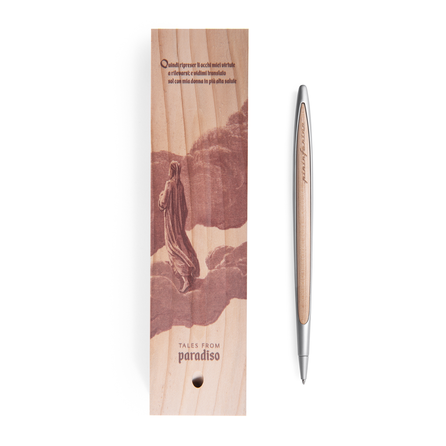 Лимитированная коллекция бренда Pininfarina в память о Данте Алигьере, приуроченная к 700-летию его смерти, с изображениями TALES FROM PARADISO - третьей части Рай знаменитой Божественной Комедии. Коробка из массива кедра, которая является одновременно настольной подставкой для шариковой ручки Cambiano, с иллюстрацией Гюстава Доре, изобюражающей Рай в виде божественного леса, в котором дует легкий ветерок, создаваемый вращением небесных сфер. Корпус ручки выполнен из алюминия с вставками из кедрового дерева. Вес ручки 39 гр, длина 16 см. В ручке используется шариковый стержень CROSS® 8513 с синей пастой. Набор упакован в подарочную коробку.