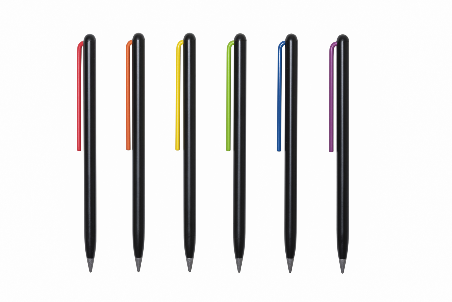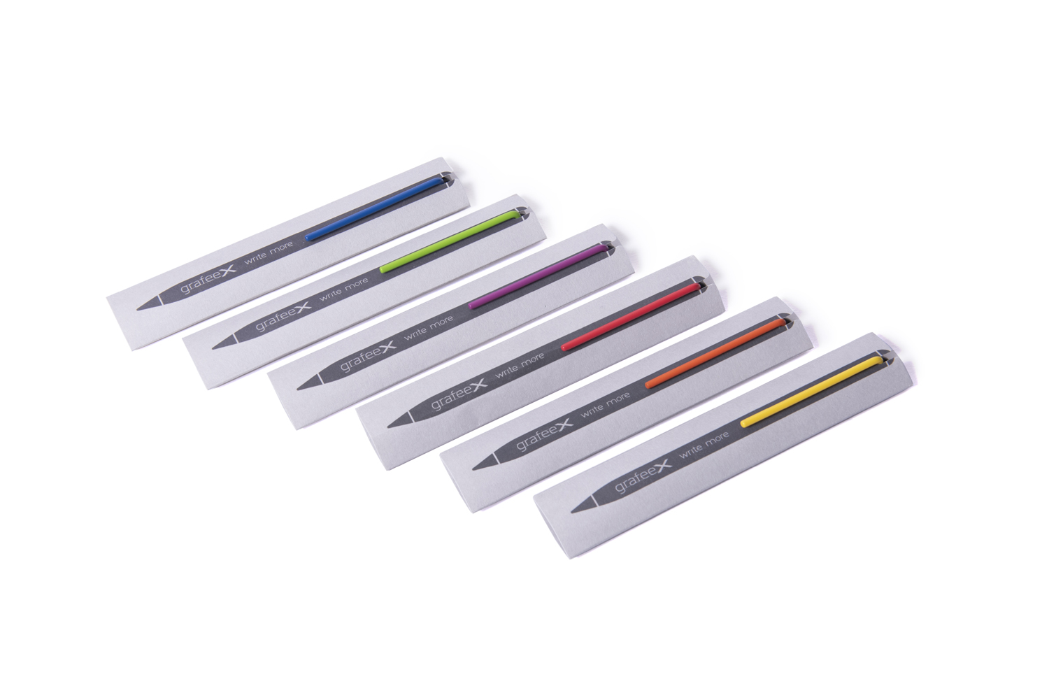 Инновационный, совершенно необычный карандаш с цельным алюминиевым матовым корпусом черного цвета, ярким фиолетовым клипом и пишущим наконечником из материала GrafeeX. GrafeeX - это запатентованный инновационный материал, полученный в результате спекания мелких частиц графита при высоких температурах. То есть он пишет, как обычный графитовый карандаш, но из-за высокой плотности материала крайне экономно расходуется, и его хватает очень надолго. Карандаш вкладывается в элегантный темно-серый чехол с контрастной прострочкой в цвет клипа, сшитый вручную из рециклированной кожи. GrafeeX станет идеальным помощником в повседневной жизни: для заметок, для набросков или просто для записи идей на бумаге.