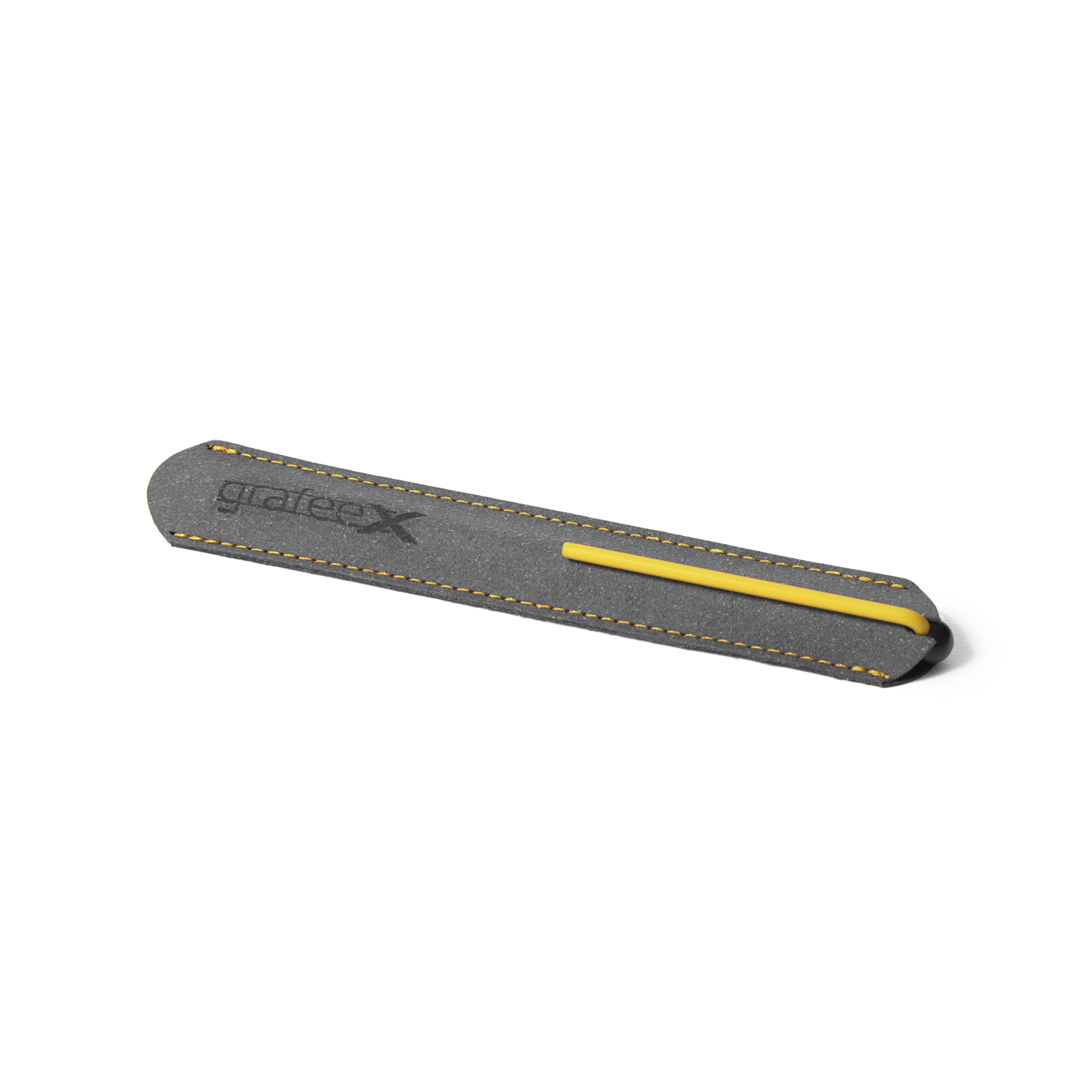 Инновационный, совершенно необычный карандаш с цельным алюминиевым матовым корпусом черного цвета, ярким фиолетовым клипом и пишущим наконечником из материала GrafeeX. GrafeeX - это запатентованный инновационный материал, полученный в результате спекания мелких частиц графита при высоких температурах. То есть он пишет, как обычный графитовый карандаш, но из-за высокой плотности материала крайне экономно расходуется, и его хватает очень надолго. Карандаш вкладывается в элегантный темно-серый чехол с контрастной прострочкой в цвет клипа, сшитый вручную из рециклированной кожи. GrafeeX станет идеальным помощником в повседневной жизни: для заметок, для набросков или просто для записи идей на бумаге.