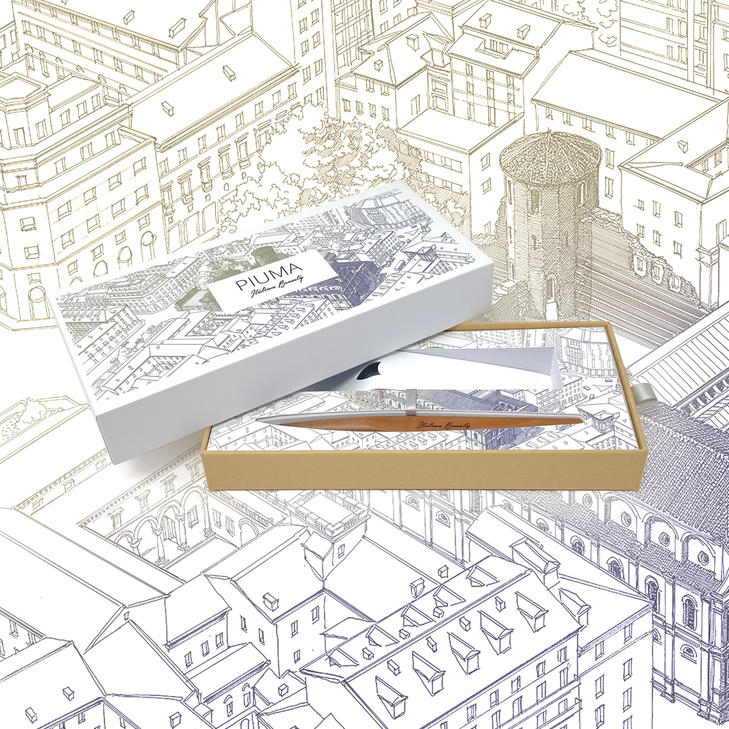Вечная ручка Pininfarina Piuma Флоренция из лимитированной коллекции дизайнеров Pininfarina в сотрудничестве с Francesco Corni Foundation, посвященной красоте Италии и представленной 8 городами. Франческо Корни - выдающийся дизайнер из Модены, посвятивший свою жизнь популяризации истории и архитектуры. Используя трехмерное перспективное видение, он изучает наиболее значимые здания каждого города, выбирает наилучшую точку обзора, чтобы подчеркнуть их особенности, и прорисовывает детали в древней технике калиграфии. Дополняет видение мастера умелое использование цветов, по одному для каждого города. Для Флоренции дизайнер выбрал центром композиции Corridoio Vasariano, идущий от Palazzo Vecchio до Palazzo Pitti, и фиолетовый цвет, в результате подарочная коробка c ручкой Pininfarina PIUMA становится произведением искусства. PIUMA - ручка динамической формы в виде гусиного пера. Дизайнеры вдохновлялись Кодексом о полете птиц мастера Леонардо да Винчи, целью которого было понять тайну полета и который хранится сейчас в Королевской библиотеке Турина. Piuma находится в постоянном равновесии со своим центром тяжести благодаря белому стальному пьедесталу. Вечная ручка имеет необычный пишущий узел в виде наконечника Ethergraf®, изготовленного из сплава металлов по запатентованной технологии. Он не содержит свинец и алюминий, производится вручную итальянскими мастерами и практически не расходуется за десятилетия использования. При соприкосновении с поверхностью бумаги, происходит химическая реакция и наконечник оставляет серебристый след, который напоминает цвет графитового карандаша, но обладает большей стойкостью. Идеально пишет на каменной бумаге. На ручке стильный логотип Italian Beauty, она полностью сделана из дерева груши. Набор упакован в белую подарочную коробку.