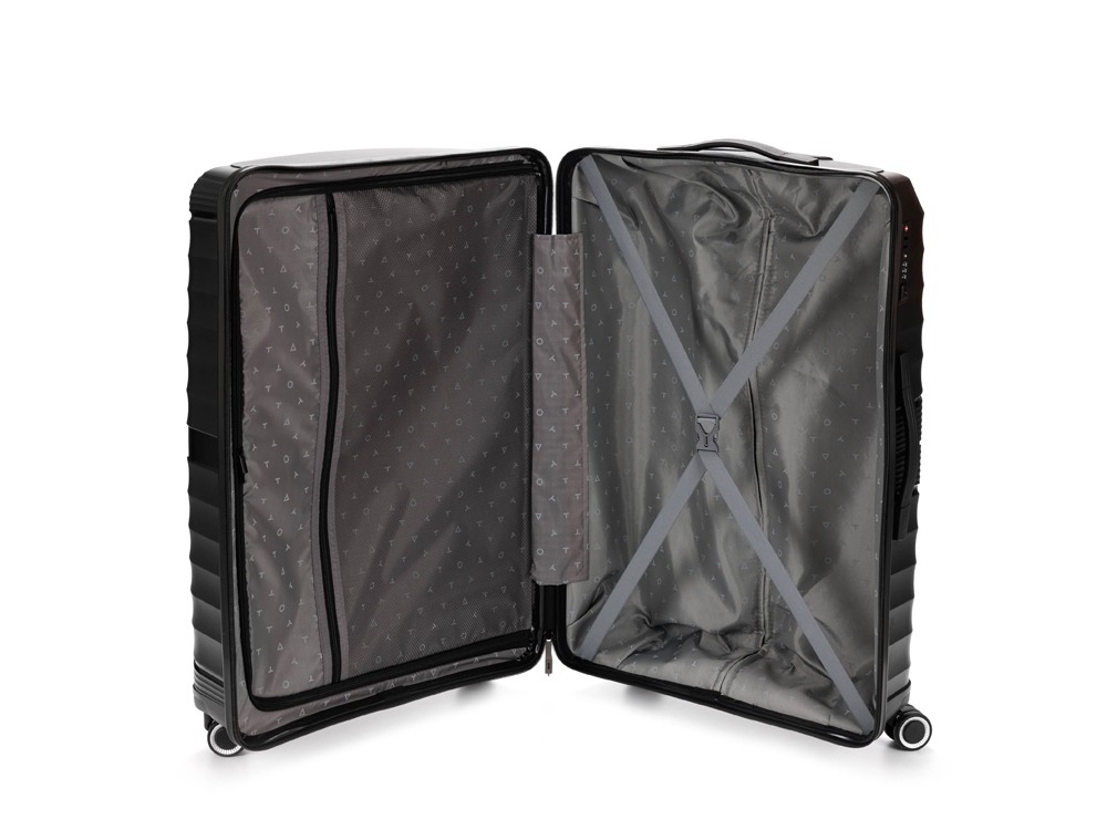 Чемодан полностью раскрывается на 2 вместительных отделения, с перегородкой на молнии и ремнями в форме Y для надежной фиксации вещей на месте.