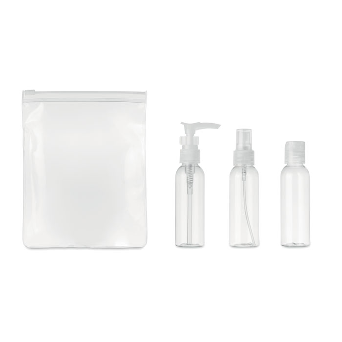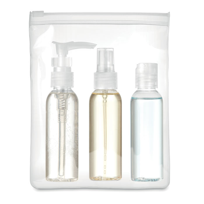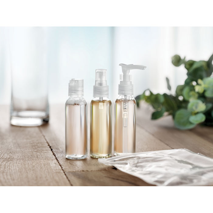 Дорожный набор из 3 флаконов из полипропилена. Представлен в прозрачной косметичке из PEVA. Емкость каждого флакона 60 мл.