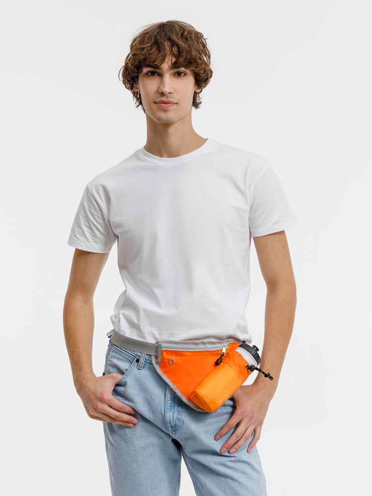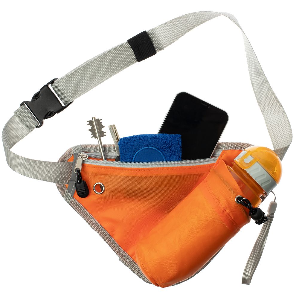 Сумка имеет внешний карман на молнии для хранения телефона и полезных мелочей и отделение со шнуром-фиксатором под бутылку для воды диаметром до 7 см. Ремень выполнен из прочной регулируемой стропы. Светоотражающие детали помогут оставаться заметными во время тренировок в сумерках и темноте.