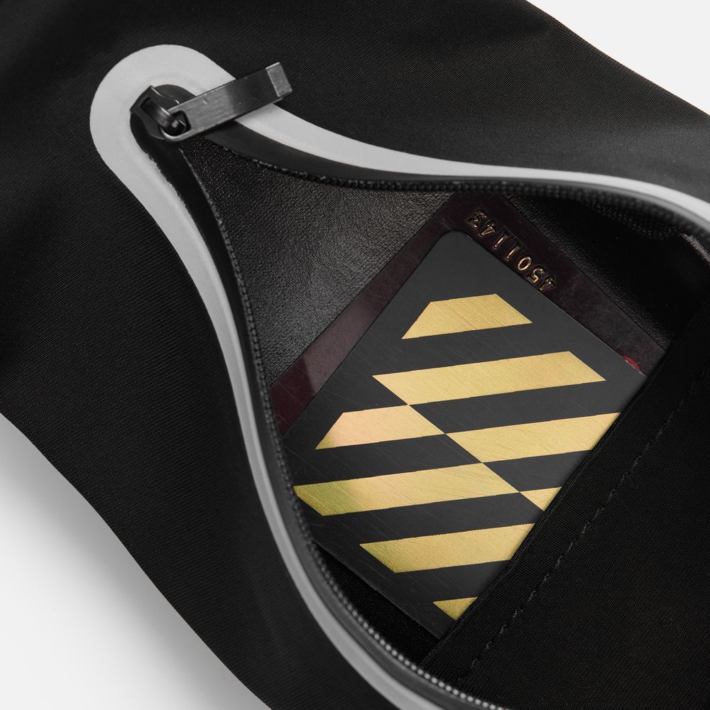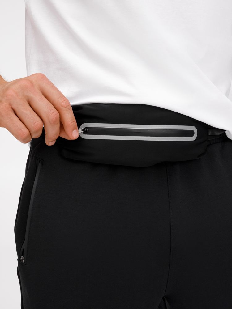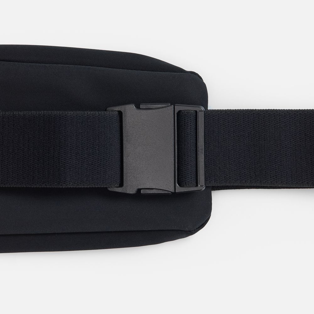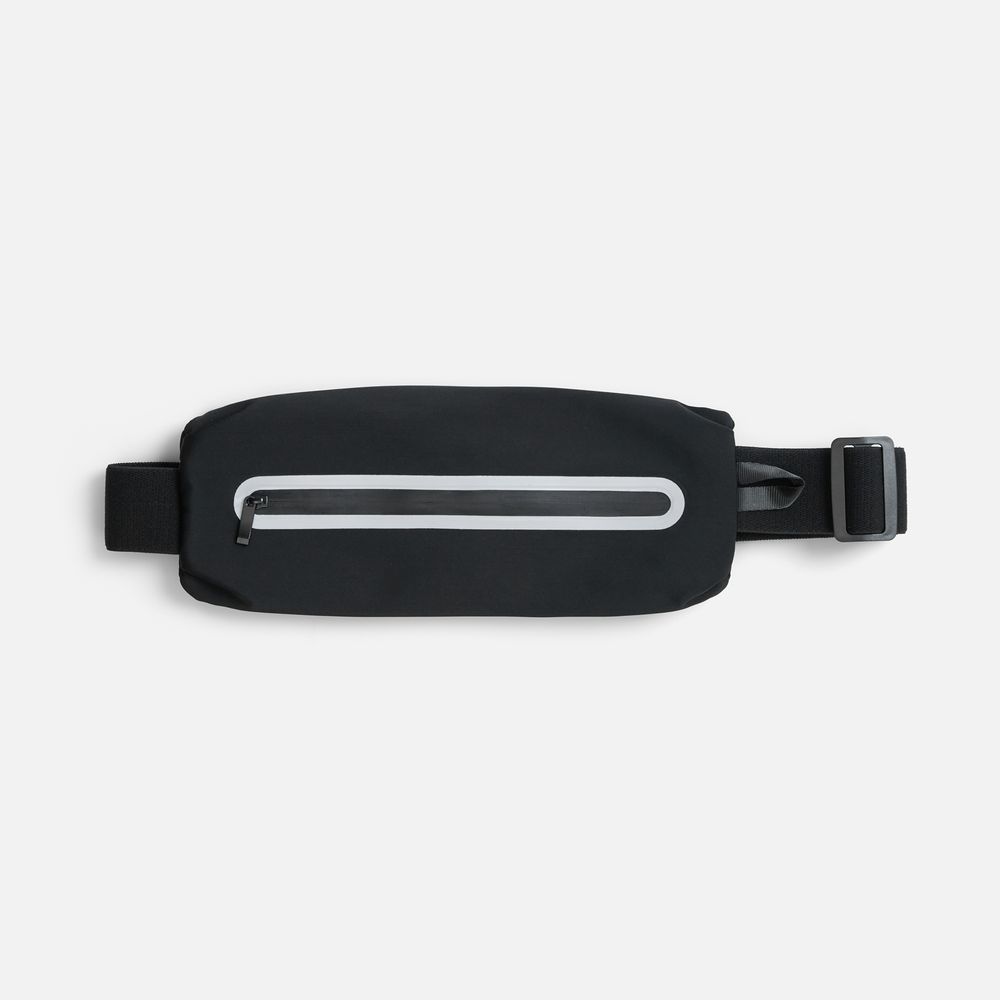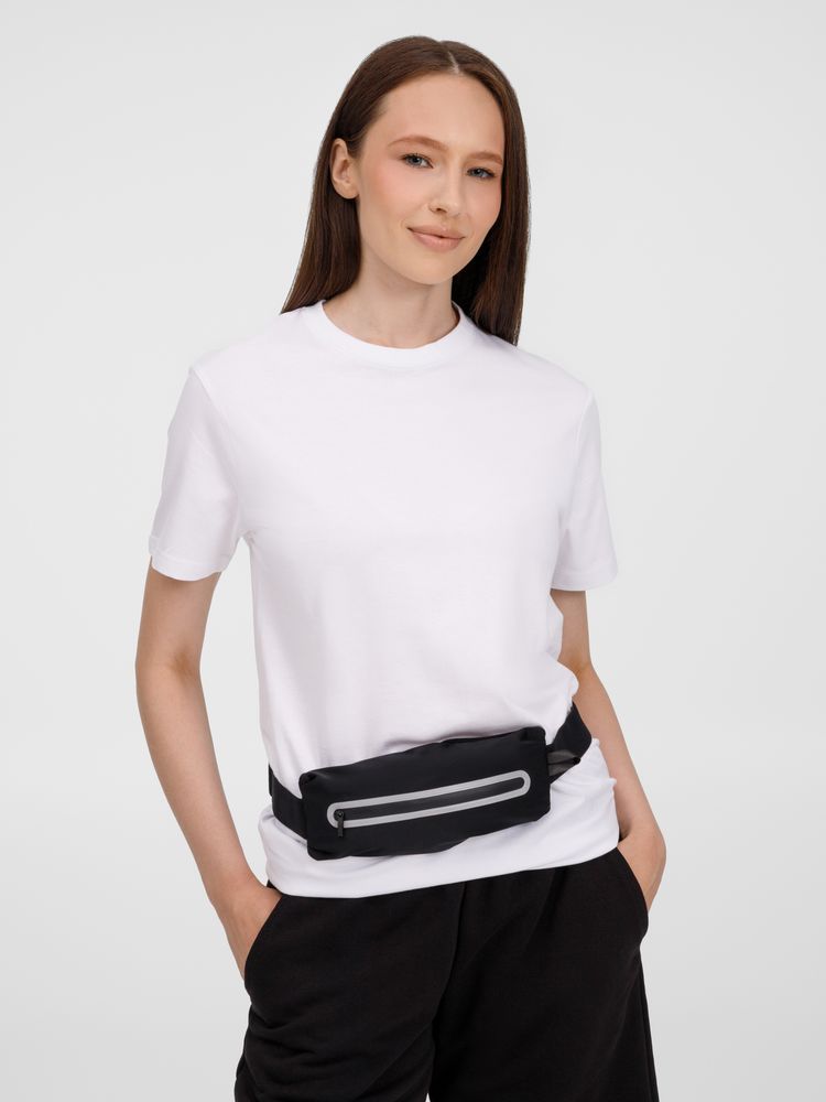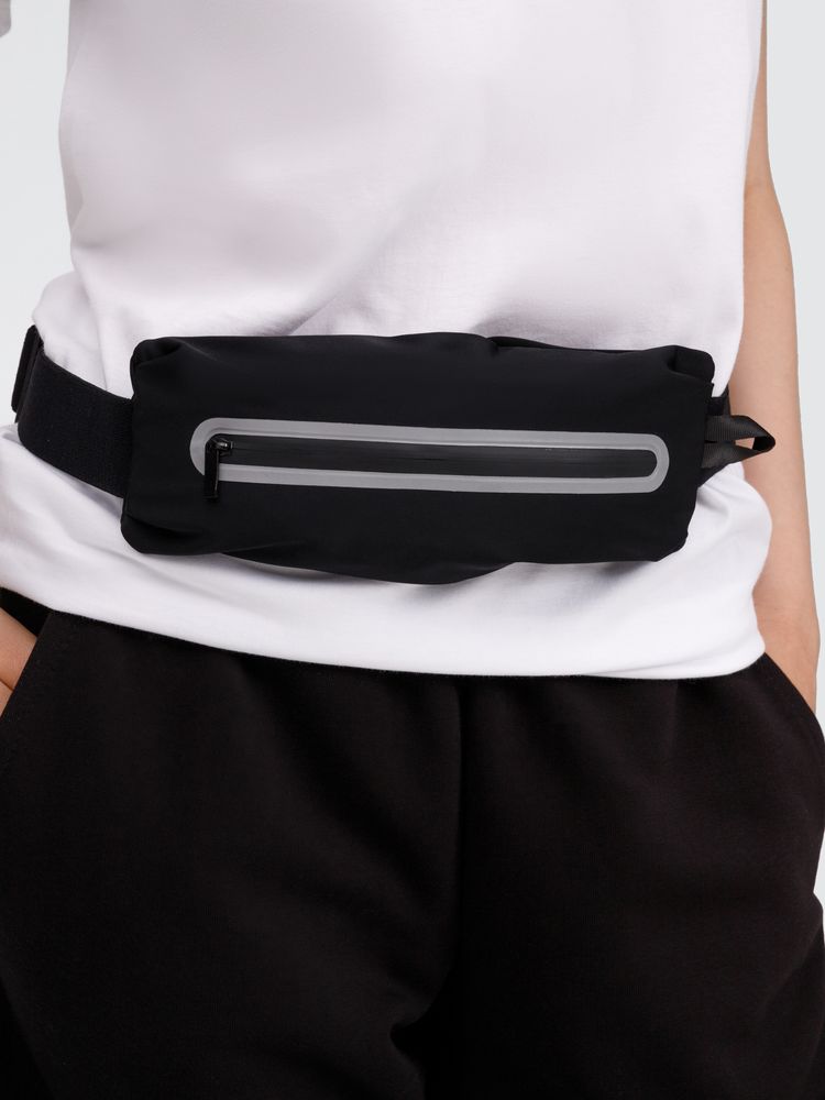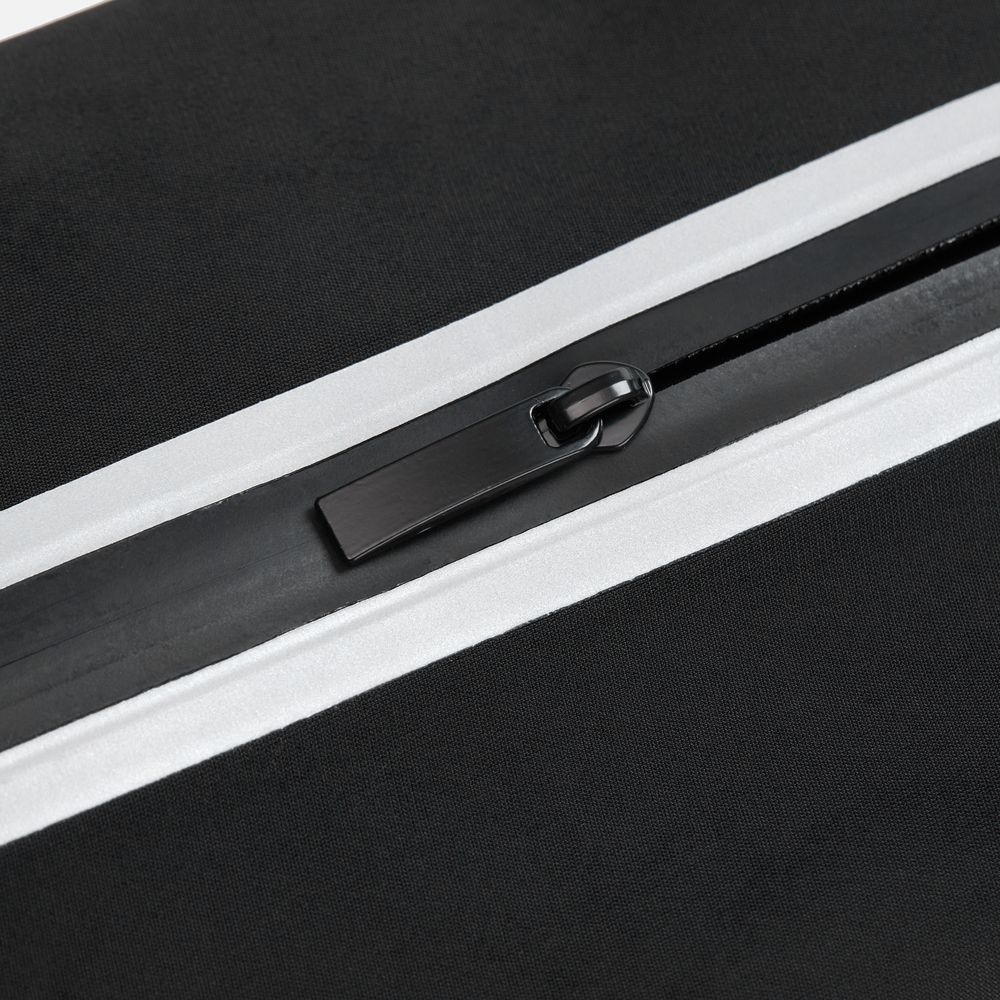 Регулируемый ремень из широкой эластичной резинки с плоским фастексом плотно облегает тело и удерживает сумку во время тренировок. Водоотталкивающая пропитка ткани защитит от влаги и грязи, а светоотражающие детали помогут оставаться заметными во время тренировок в сумерках и темноте.