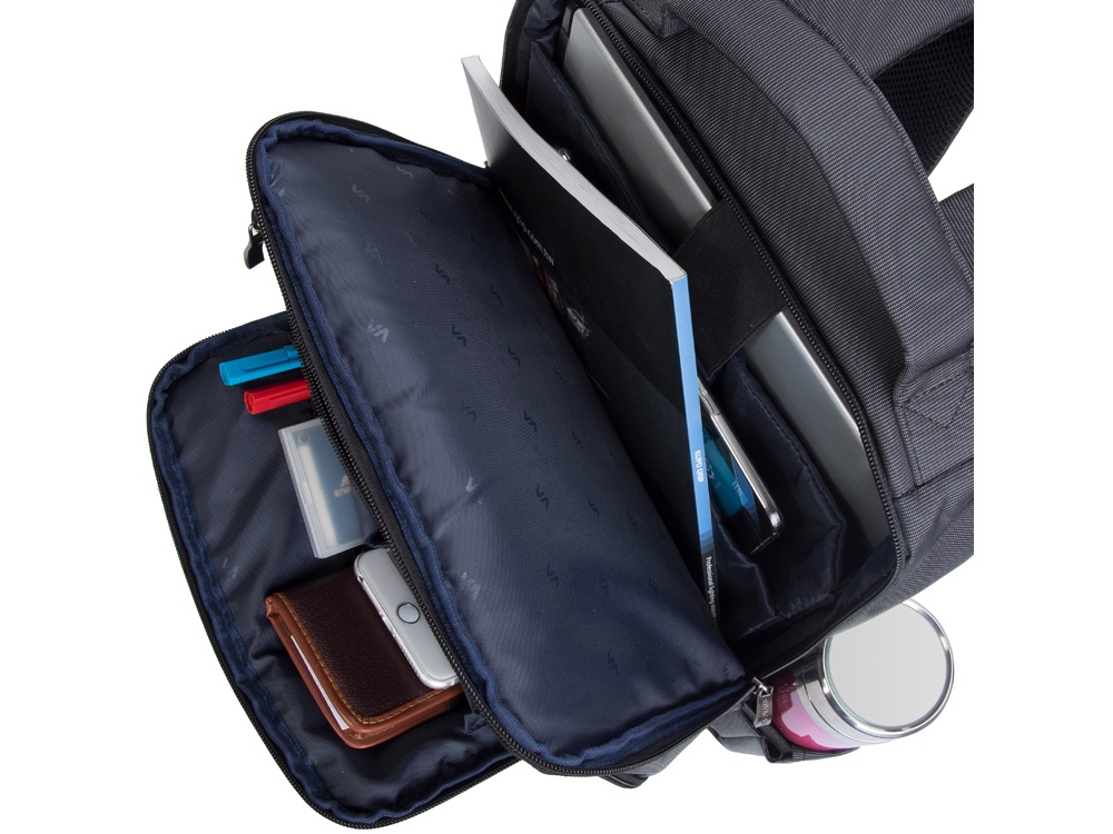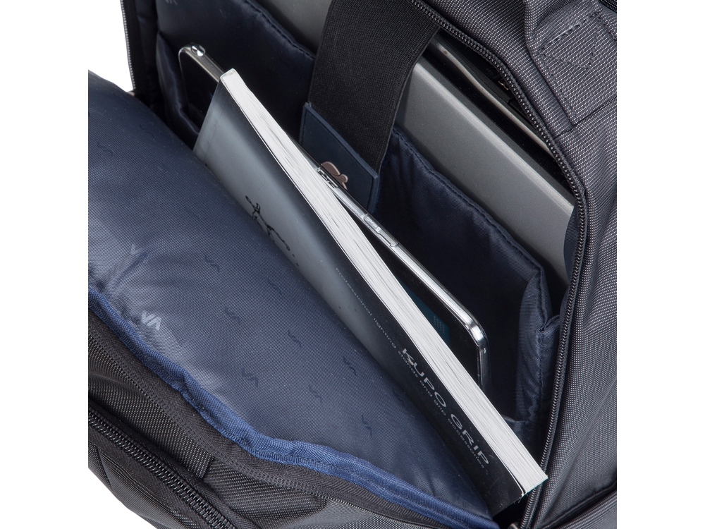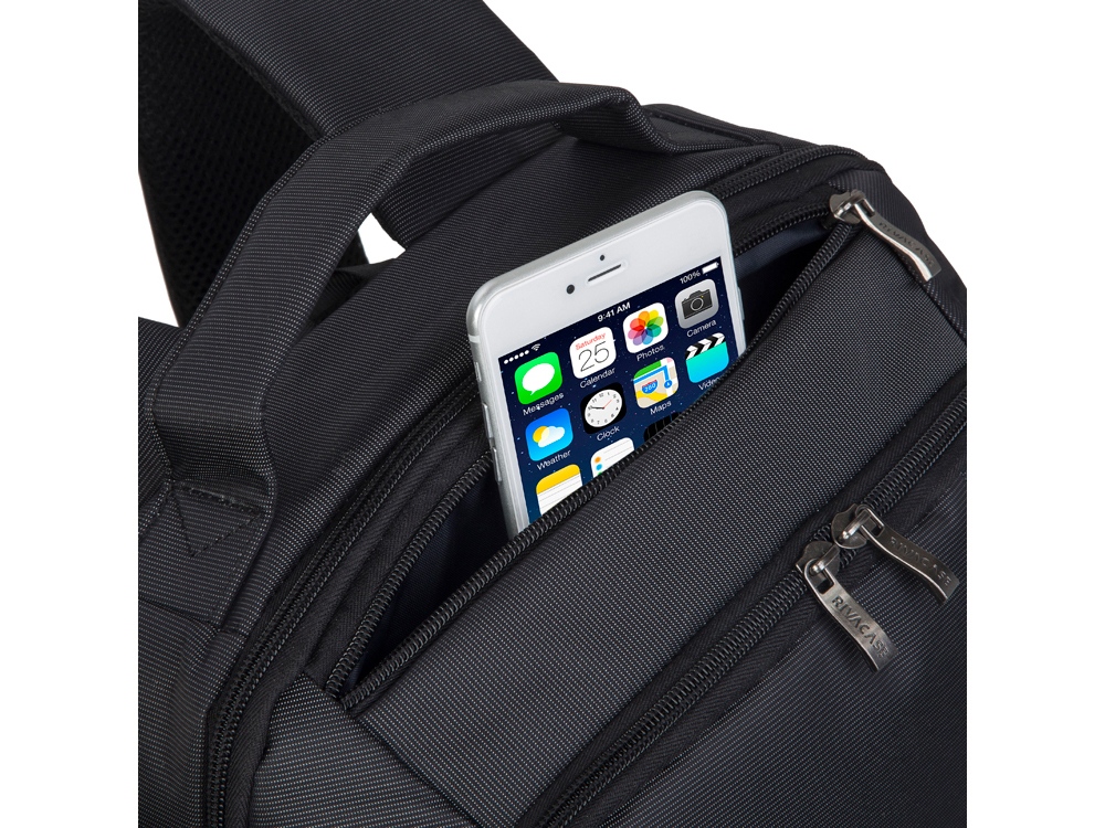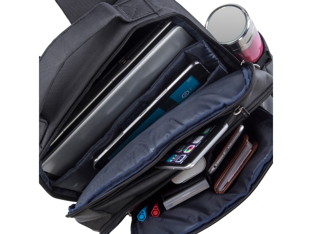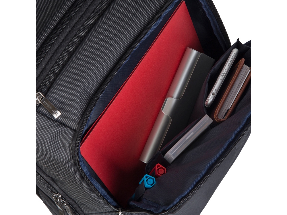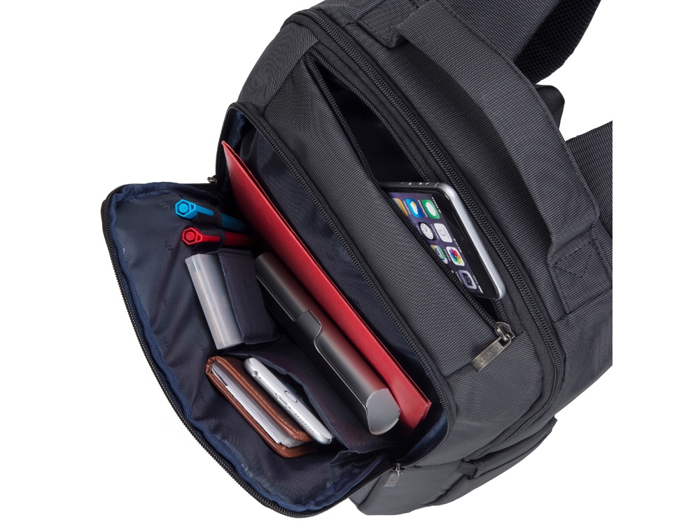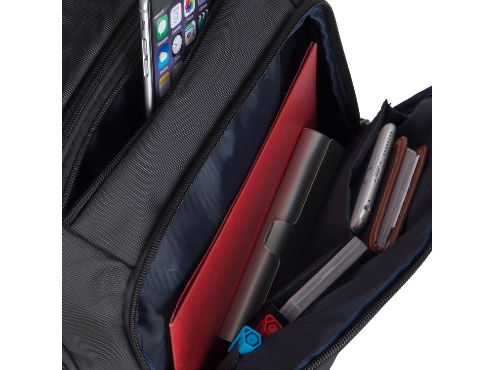 • Передний карман на молнии для хранения аксессуаров, зарядного устройства, также оборудован панелью-органайзером для хранения визитных карт, авторучек, смартфона.
