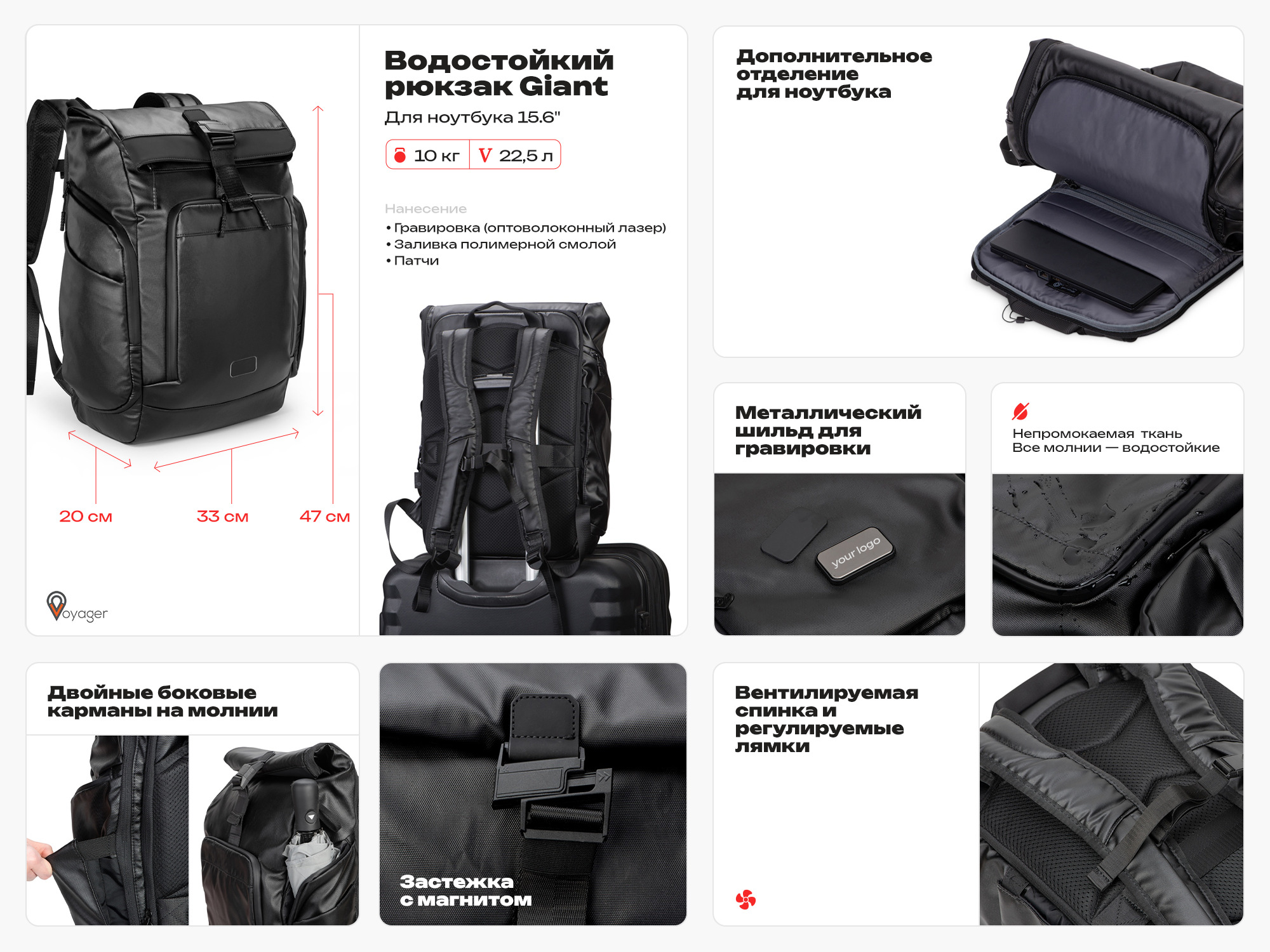 Большой вместительный рюкзак из непромокаемой ткани с водостойкими молниями снабжен множеством функций.