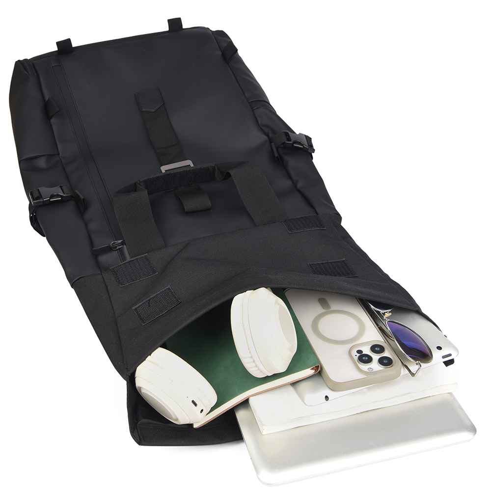 Два боковых кармана значительно расширяют функционал: один на водонепроницаемой молнии со скрытым звеном с карманом-сеткой для мелких гаджетов внутри. Второй, открытый с возможностью увеличения объёма с помощью молнии позволит разместить бутылку, зонт и всё что необходимо для быстрого доступа