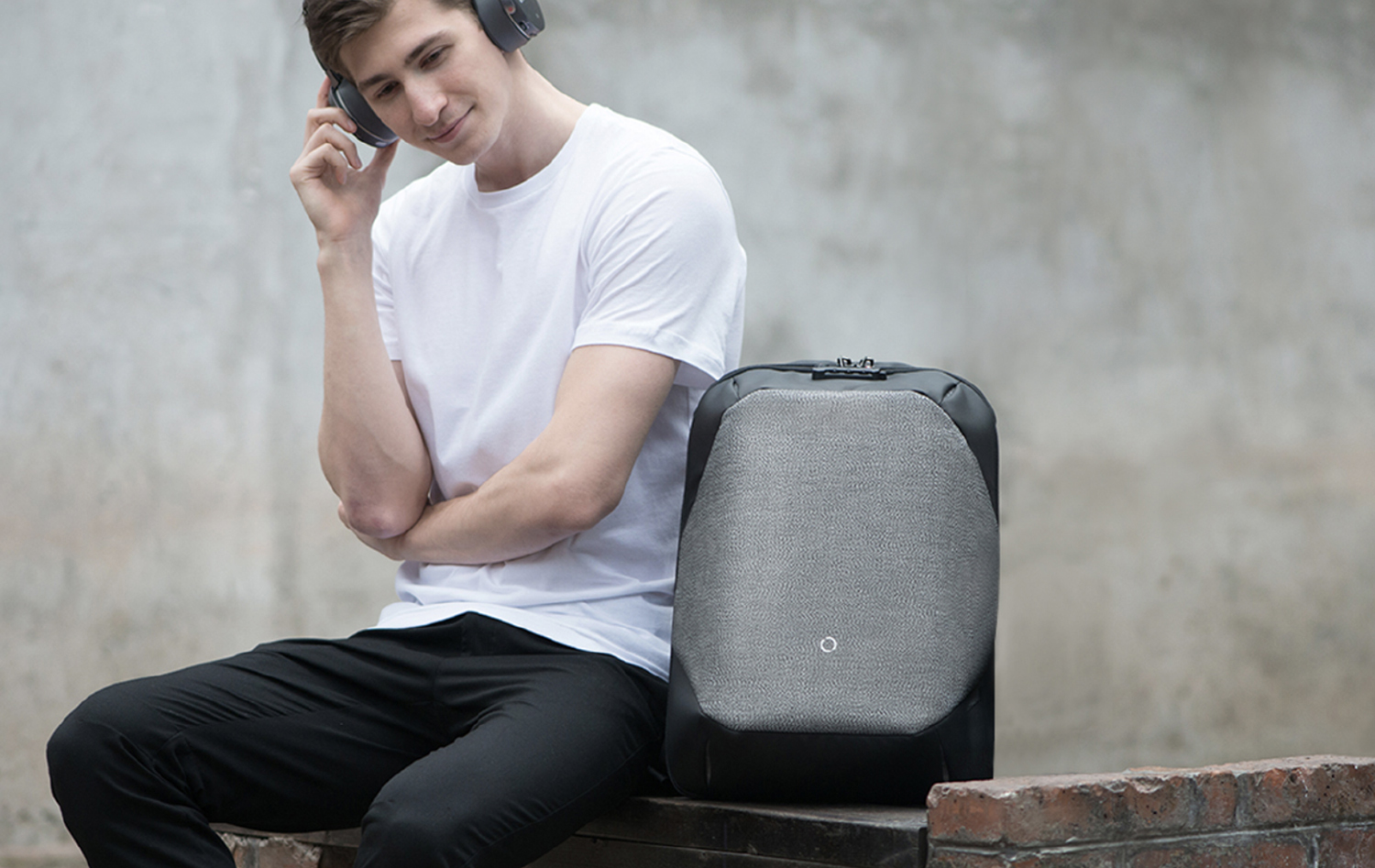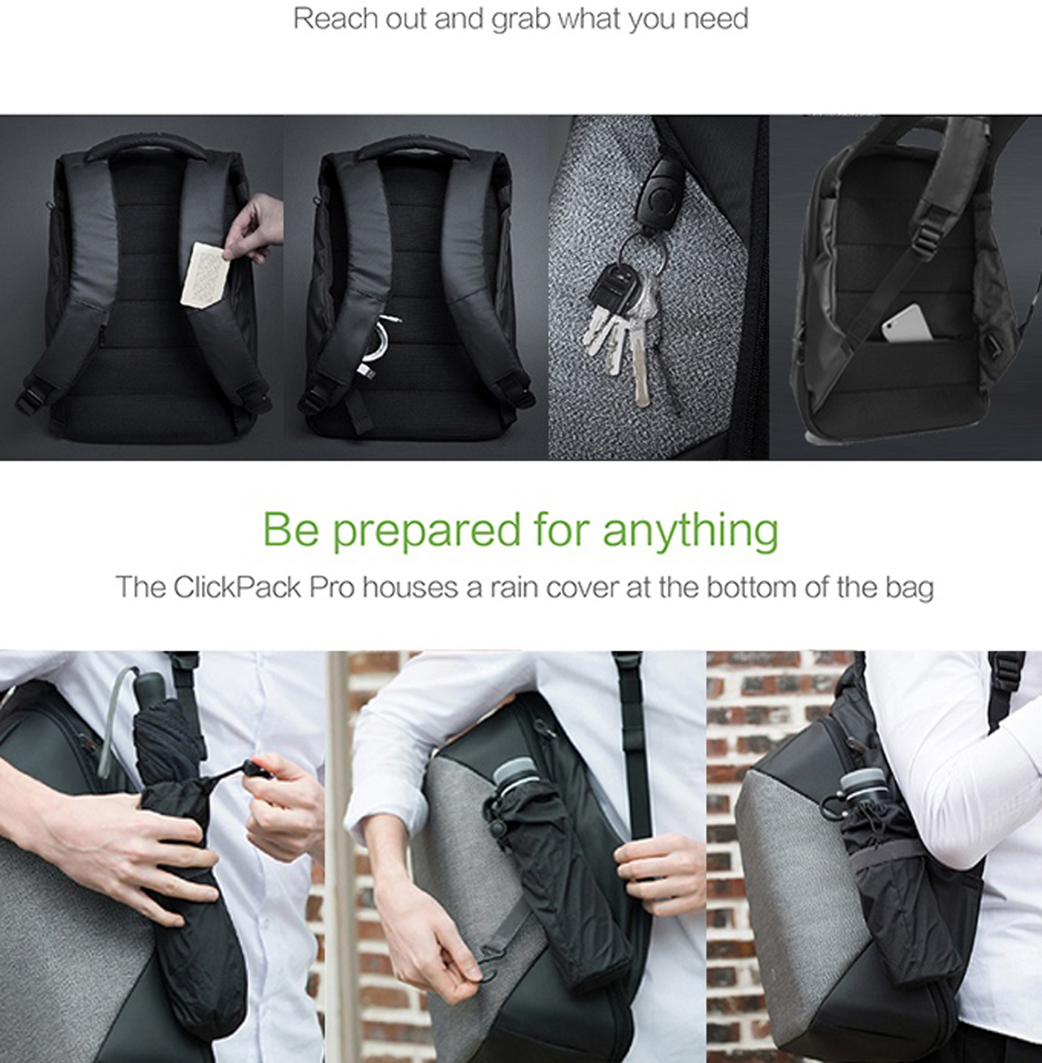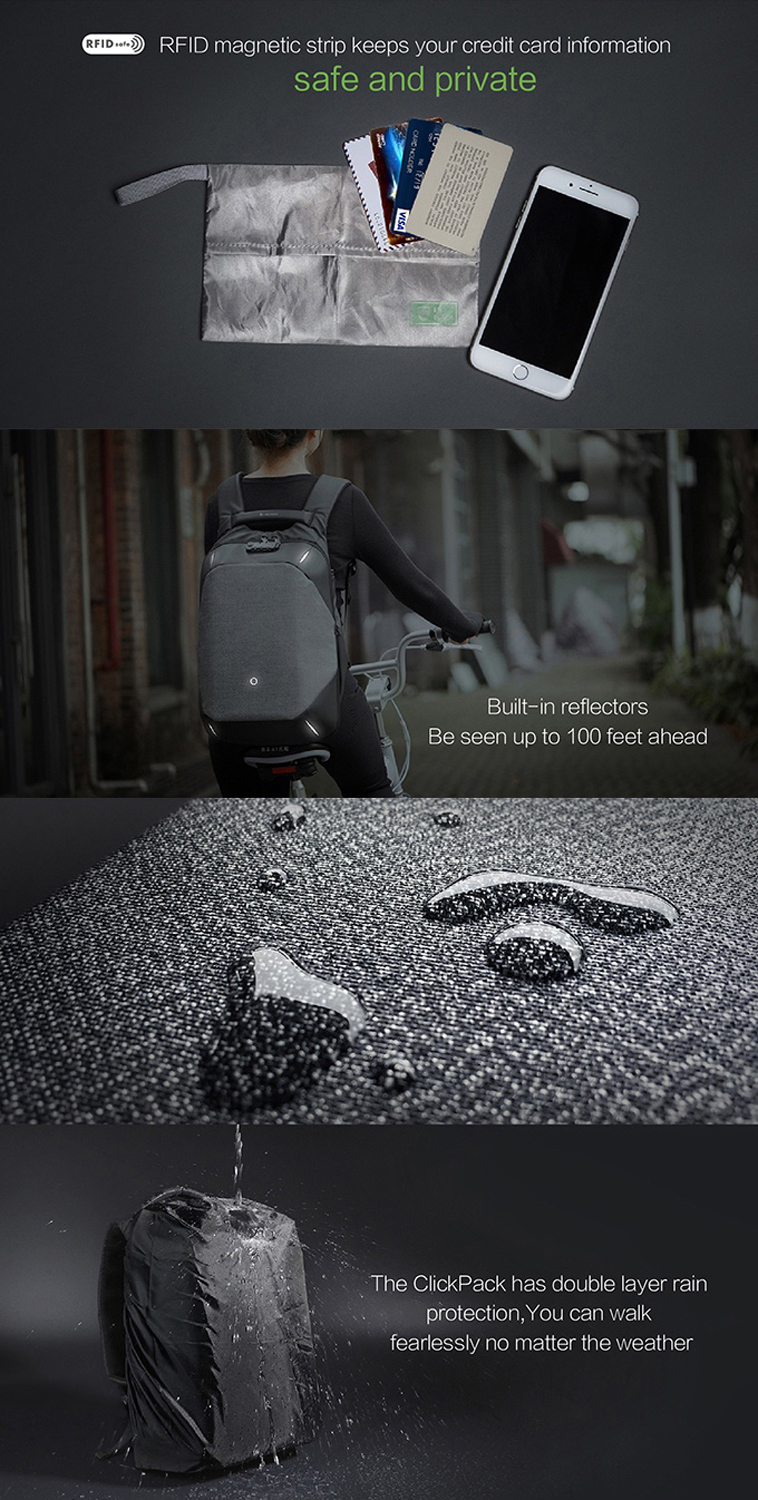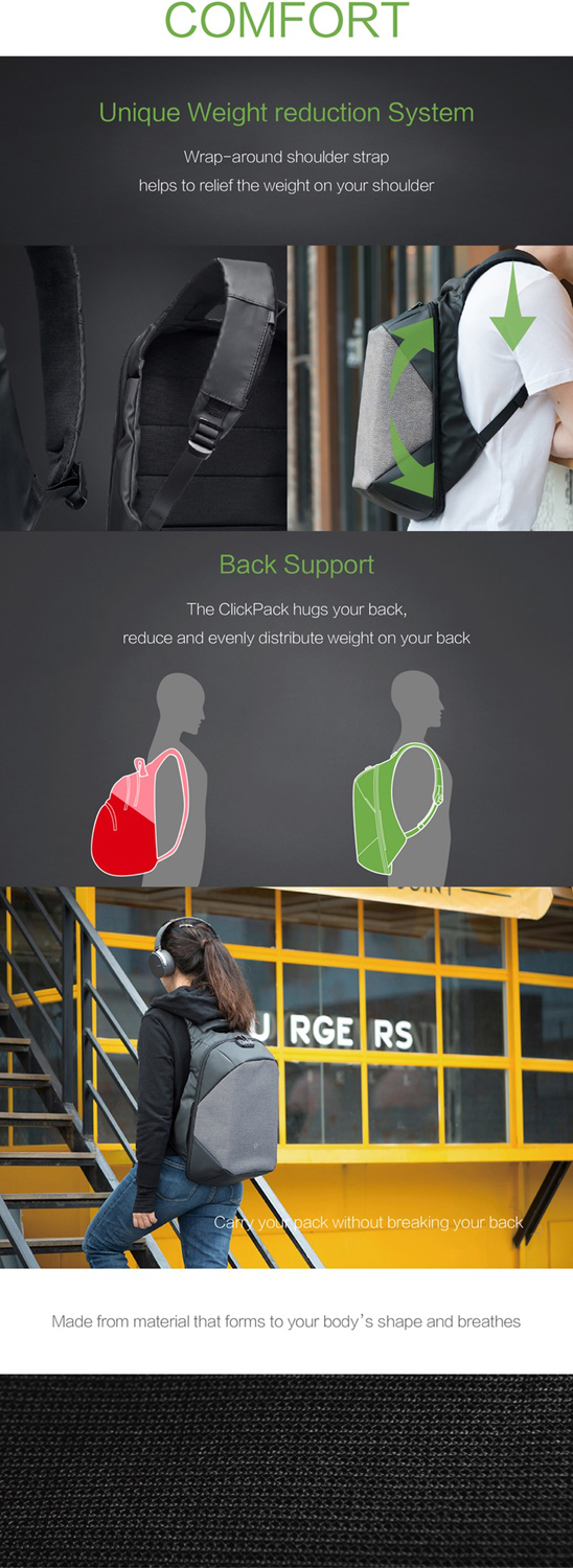 Вместительный рюкзак для путешественников ClickPack Pro из комбинации серого и черного цветов, обладатель премий Good Design Award 2017, Red Dot Design Award 2018, iF Design Award 2018, CMF Design Award, China Red Star Design Award, International Design Excellence Award, Upstyle Award 2018. Сделан из высокопрочного устойчивого к порезам и трению водоотталкивающего материала многослойного плетения из разных типов ткани: нейлон, полиэстер и стекловолокно. Не требует специального ухода. Конструкция достаточно жесткая, не деформируется. Детально продуманная организация отделений позволяет грамотно распределить вес. Самые тяжелые предметы располагаются ближе к спине. Благодаря плотным перегородкам ноутбук и планшет надежно фиксируются и не перемещаются при ходьбе. Специальная анатомическая конструкция и вентилируемая мягкая спинка снижают нагрузку на плечи и спину, вес рюкзака воспринимается на 20-25% легче, чем при использовании стандартных моделей рюкзаков.