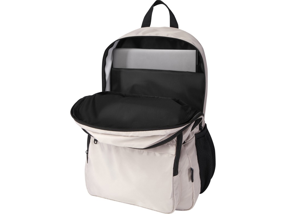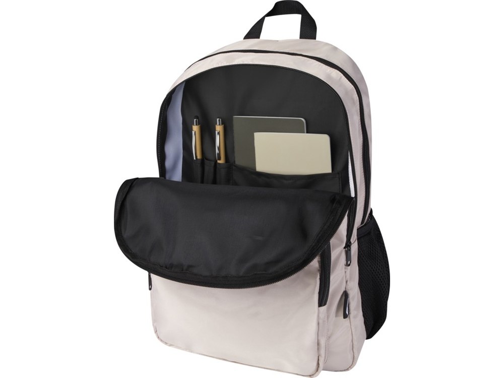 Рюкзак Trend Plus изготовлен из сертифицированной согласно GRS переработанной мягкой и немнущейся ткани и качественной подкладки из RPET. Рюкзак оснащен отделением для ноутбука диагональю 15, отделением-органайзером, передними карманами на молнии, боковыми эластичными сетчатыми карманами и сетчатой вентилируемой задней частью с лямкой для крепления к ручке чемодана. Регулируемые плечевые ремни для оптимального комфорта при ношении. Объем: 20 литр. Выдерживает вес до 10 кг. Не содержит ПВХ. GRS certified recycled polyester.