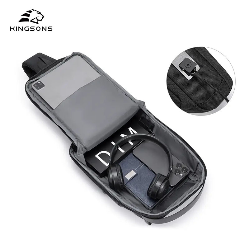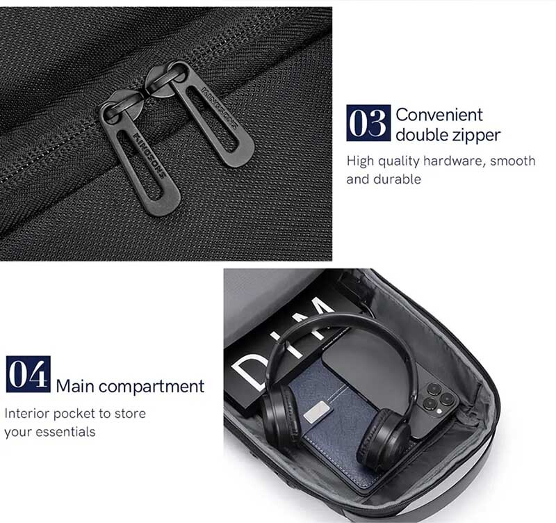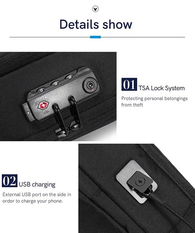 Изготовлен из водостойкой и прочной полиэфирной ткани. Двустороннее, левое плечо/правое плечо. В основном отделении можно хранить кошелек, мобильный телефон, внешний аккумулятор и другие предметы. Внешний USB-порт сбоку для зарядки телефона. Кодовый замок TSA.