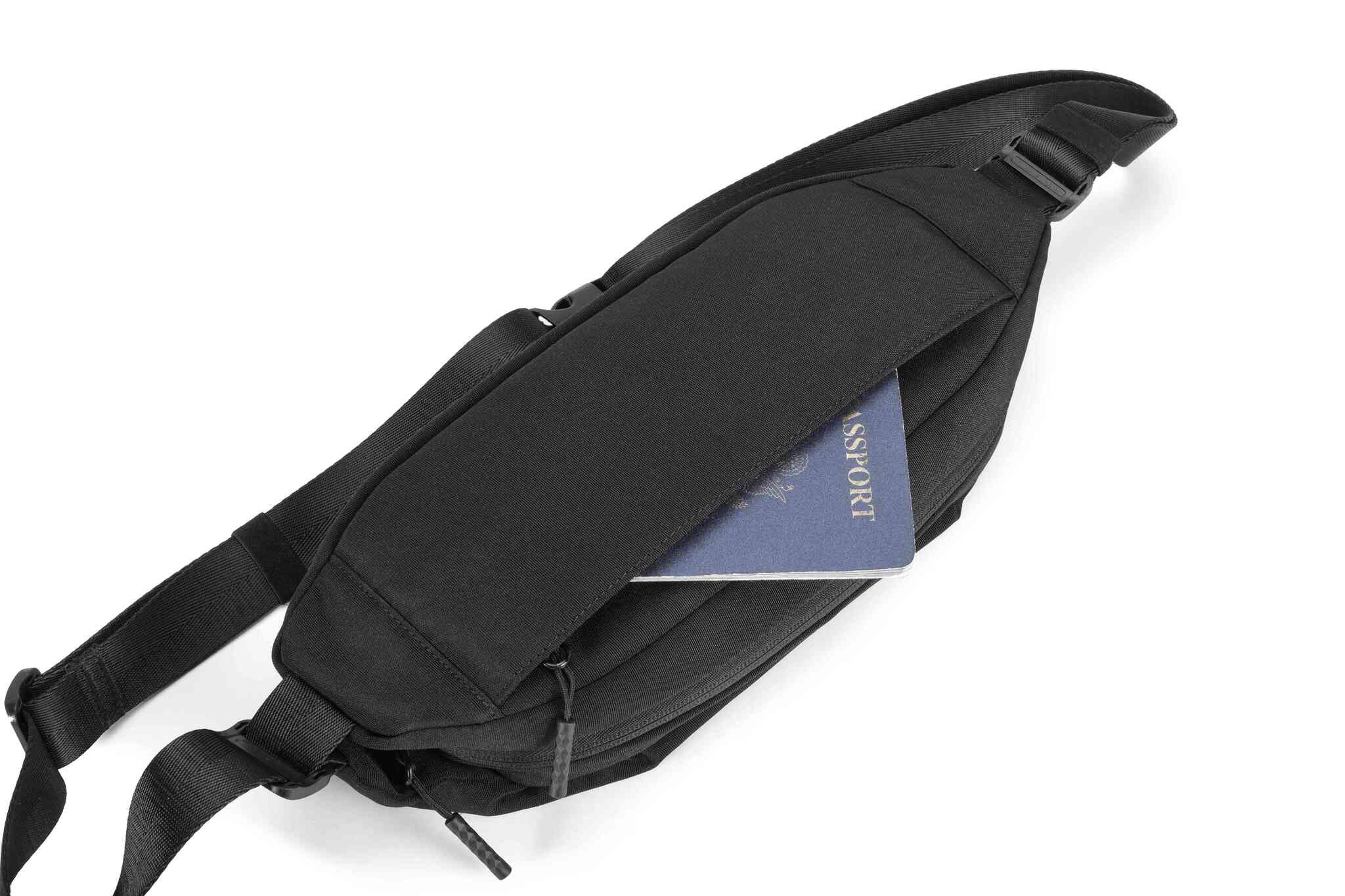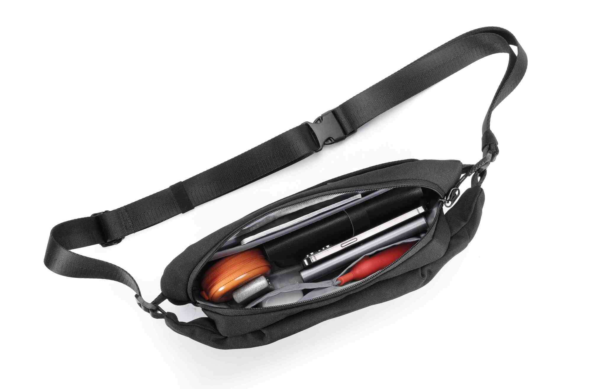 Водостойкая ткань, изготовленная из переработанного поли. Передний карман на молнии для быстрого доступа к мелочам. Регулируемый плечевой ремень для ношения на левом или правом плече.