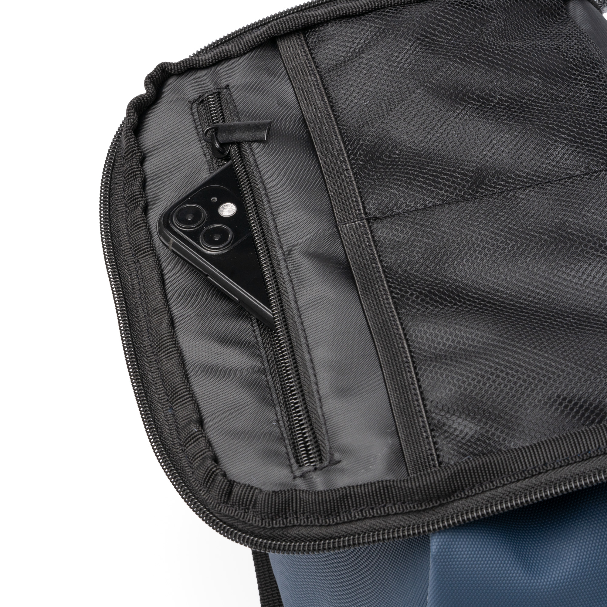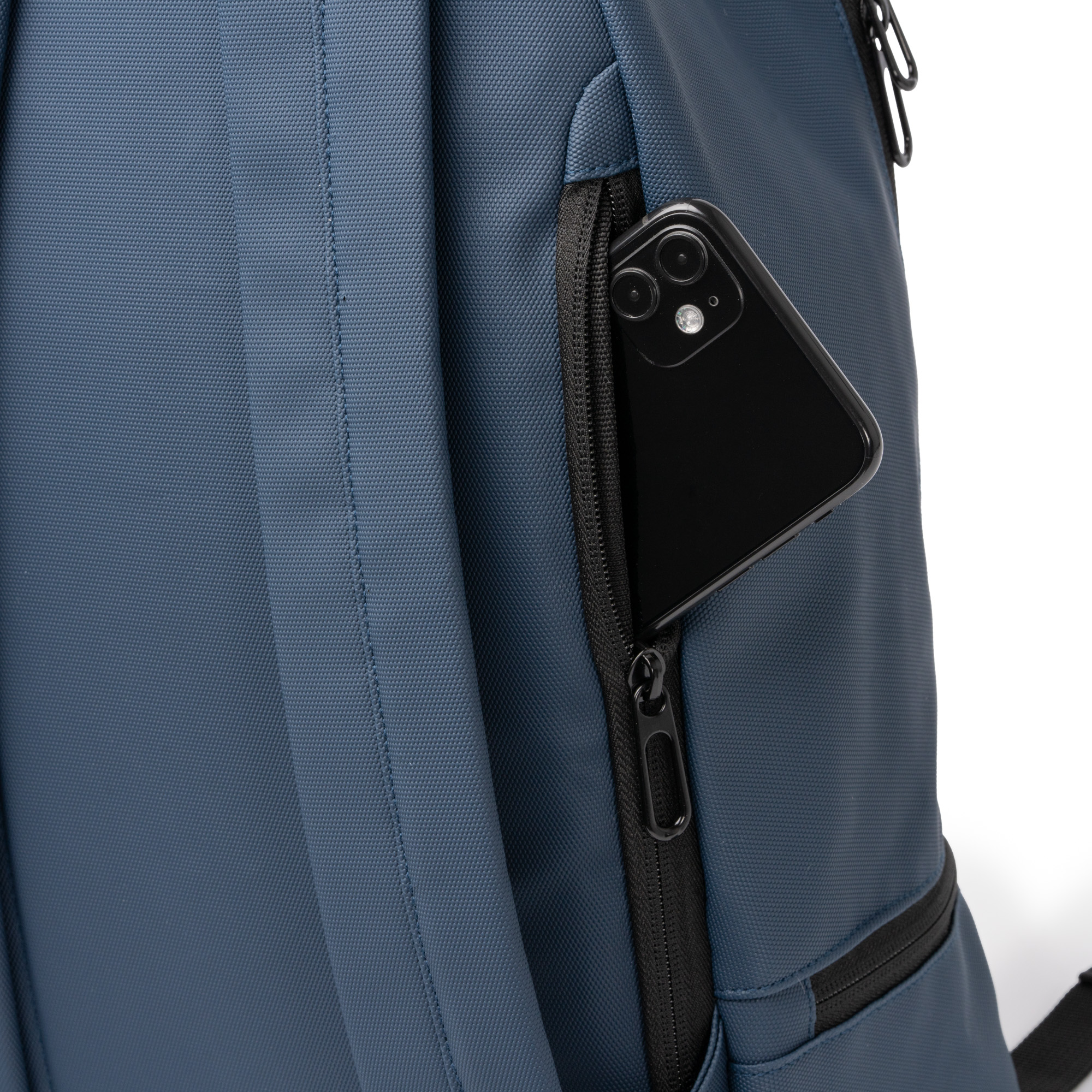 Рюкзак из искусственной кожи. Основное верхнее отделение с двойной застежкой-молнией, включая внутренние сетчатые отсеки и карман на молнии, а также карман с эластичной регулировкой для устройств до 10". В нижней части есть еще одно отделение для переноски других предметов, также с двойной застежкой-молнией. На задней части рюкзака есть вертикальный карман с защитой против кражи. Мягкая спинка и ручки для большего комфорта.